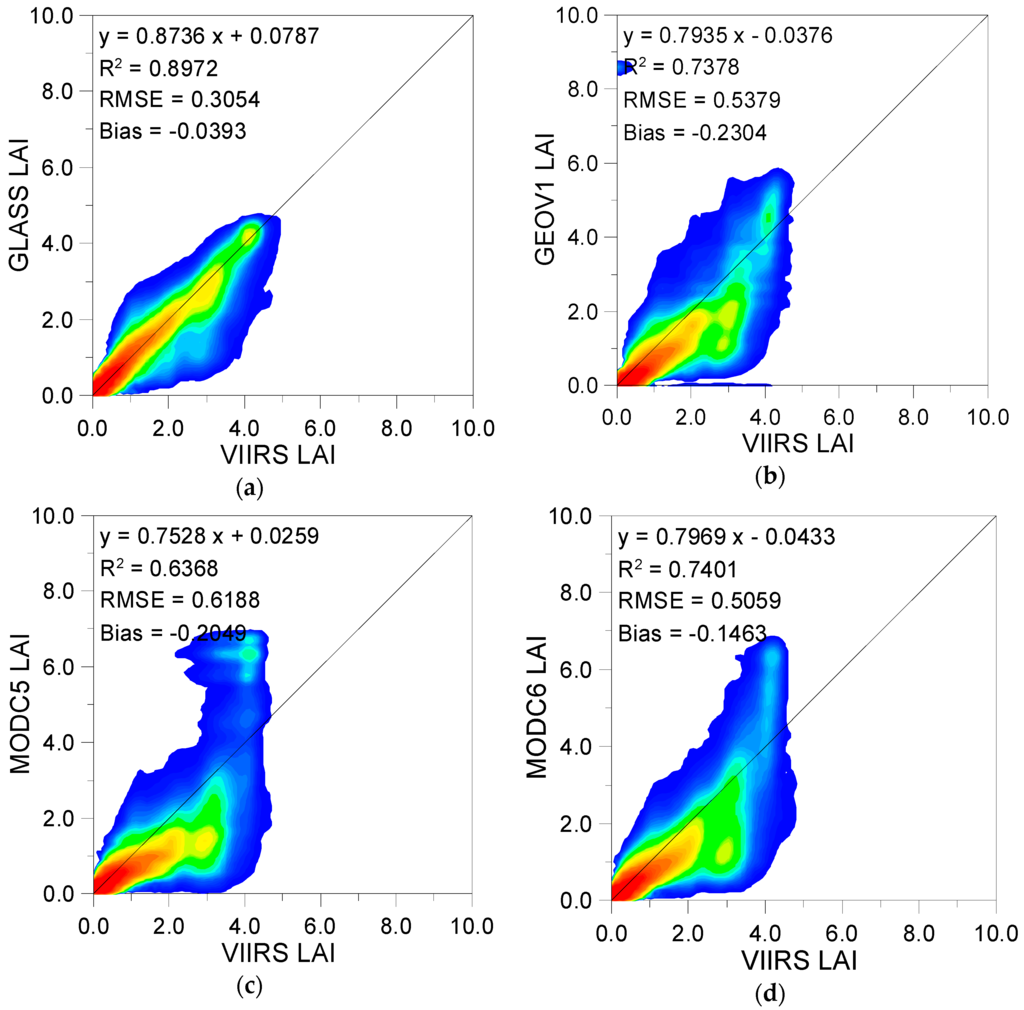Figure 4 shows density scatterplots among the VIIRS, GLASS, MODC5, MODC6, and GEOV1 LAI values for tile h09v05 on day 185, 2013. Only the collocated LAI values among these LAI products are included in Figure 4. Figure 4c,d illustrates that the VIIRS LAI values were slightly higher than those of MODC5 and MODC6 for lower LAI values, but clearly lower than those of MODC5, MODC6, and GEOV1 when the LAI values were greater than 3.5 LAI units. Compared with MODC5, MODC6, and GEOV1 LAI values, those of GLASS are distributed more closely around the 1:1 line against the VIIRS LAI values, which showed that the VIIRS LAI values achieved better agreement with the GLASS LAI values (R2 = 0.8972 and RMSE = 0.3054) across the LAI range than did the other products. This can be attributed to the same GRNN structure for the GLASS and VIIRS LAI retrieval, and the LAI training data from the GLASS LAI product.