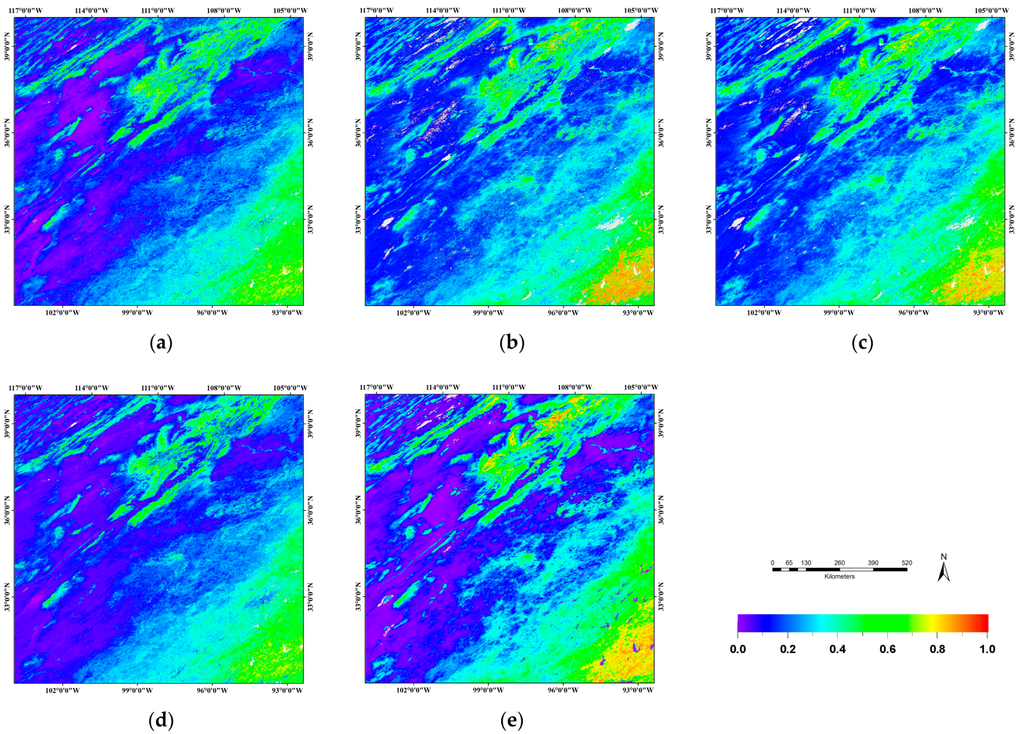 Maps of (a) VIIRS; (b) MODC5; (c) MODC6; (d) GLASS; and (e) GEOV1 FAPAR products for tile h09v05 on day 185, 2013. White color denotes water, and areas masked in grey correspond to pixels where these FAPAR products did not provide valid FAPAR values.