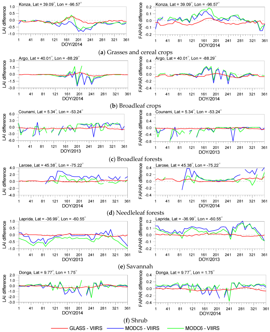 The temporal profiles of LAI and FAPAR differences for the Laprida sites with savannah biome type are shown in Figure 7e. The differences between the GLASS and VIIRS LAI values were lower than 0.11 LAI units and the differences between the GLASS and VIIRS FAPAR values were less than 0.03 units for the entire year, which demonstrated that VIIRS LAI/FAPAR values achieved very good agreement with those of GLASS at this site. The VIIRS LAI values were higher than those of MODC5 and MODC6 (up to 1.0 LAI units), whereas the VIIRS FAPAR values were lower than the MODC5 and MODC6 FAPAR values (up to 0.2 units) throughout the entire year.