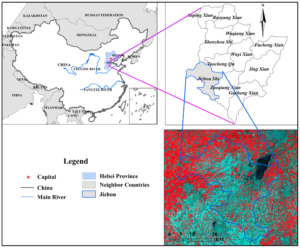 This study was carried out in Jizhou, Hebei Province, China, which is an agricultural region located from 37°18′40′′N to 37°44′25′′N and from 115°09′57′′E to 115°41′07′′E (Figure 1) in the North China Plain. The study region has a warm temperate continental monsoon climate, with a dry and windy spring, hot and rainy summer, and a cold and dry winter. The area includes many types of soil, but sandy loamy and light loamy soil accounts for approximately 85.3% of all soil types. Because this area has sufficient rain and heat that appear in synchrony with the season, it is an appropriate region for growing and developing grain and cotton. The natural elements and extensive anthropogenic influences make it possible for land cover/use types within this area to be broadly classified into cultivated land, woodland, grassland, water body, traffic land, residential land, industrial land, etc. Jizhou occupies a 9.22 × 104 ha area. The terrain is mostly flat and tilts slightly from southwest to northeast. The average elevation ranges from 22 m to 27 m. Farmland occupies 5.93 × 104 ha [17] (approximately 64.36% of the total area). The types of farmland include paddy fields, dry fields, vegetable fields, etc. The major crops in this area are cotton, winter wheat, corn and chili peppers. Cotton fields are mulched by white plastic film, and these plastic-mulched cotton fields form obvious spatial patterns in the field and in the imagery (Figure 2).