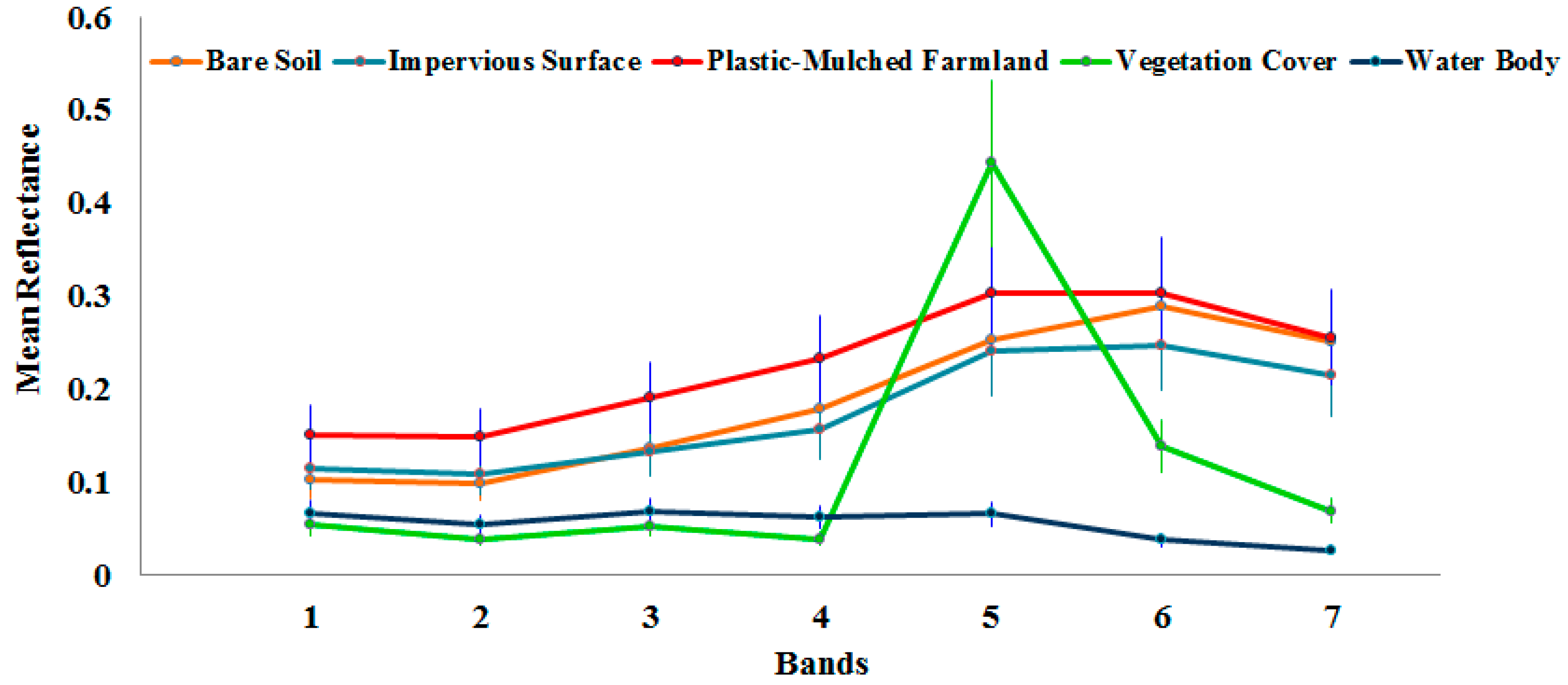 From the spectral separability of the five land cover classes (Figure 3), we can see that plastic-mulched farmland is well separated on the visible and near infrared bands. On the visible bands, these classes are clustered into three groups: plastic-mulched farmland, impervious surface and bare soil, vegetation and water bodies. Although plastic-mulched farmland and bare soil are not well separated on the shortwave infrared bands, the impervious surfaces and bare soil are well separated. The reflectance of plastic-mulched farmland is higher than the other classes on the visible and shortwave infrared bands. The reflectance of vegetation is highest on the near infrared band. Using the seven bands of OLI imagery, all five classes are well separated.