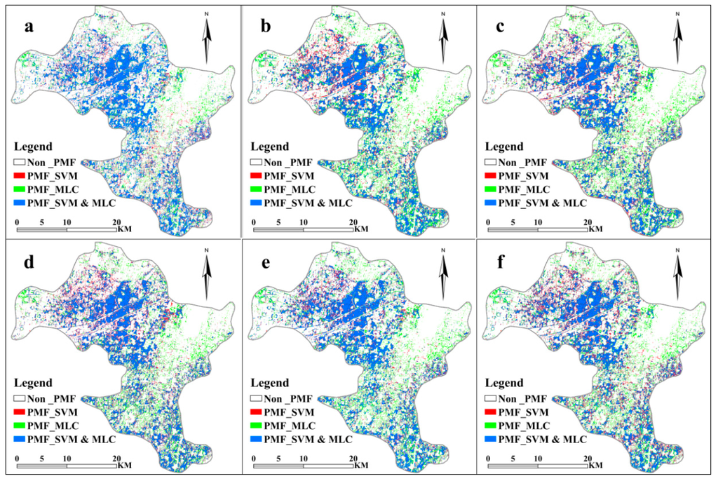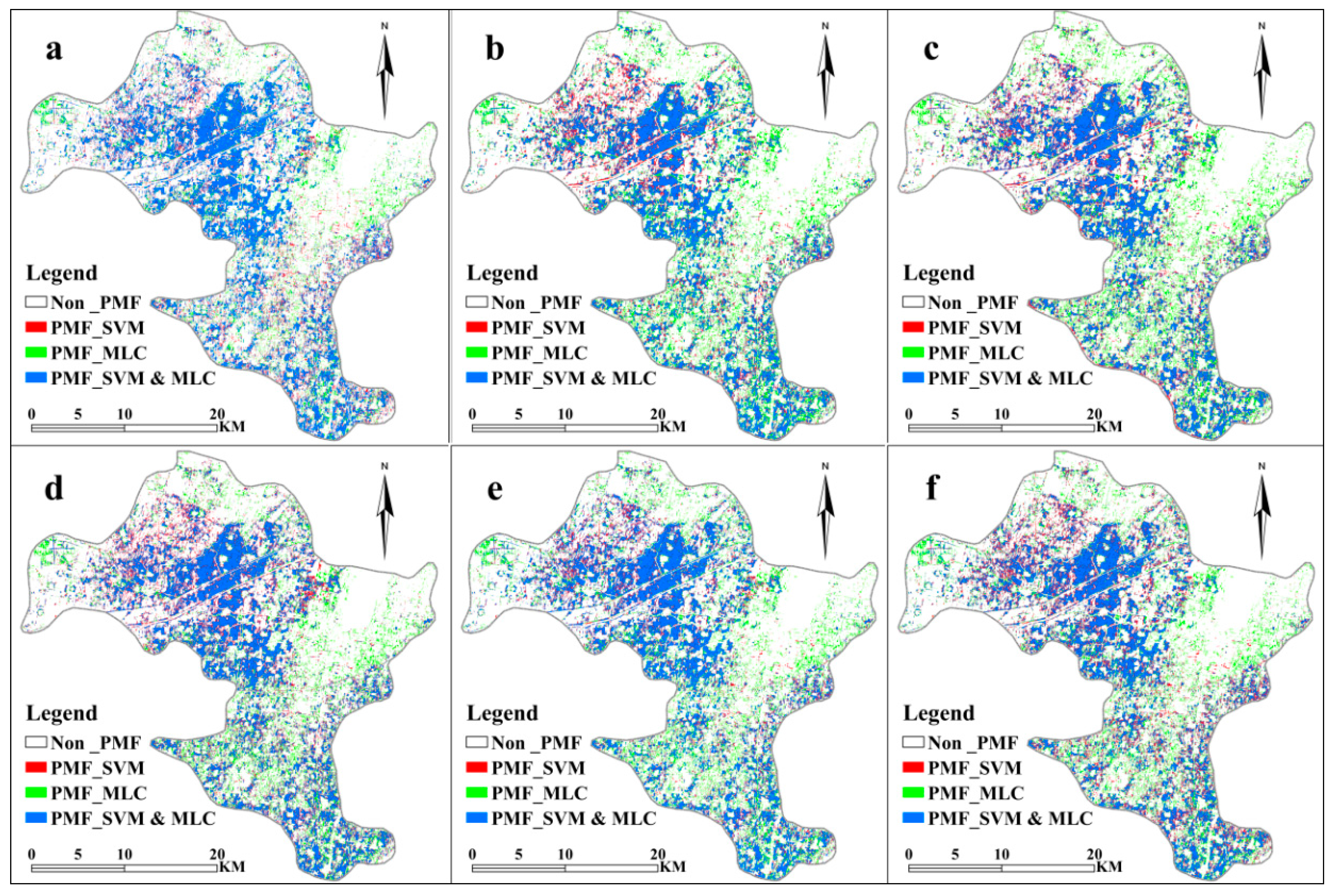 The spatial distribution of the plastic-mulched farmland extracted from different classifiers using different feature sets (Non_PMF: Non plastic-mulched farmland area; PMF_SVM: plastic-mulched farmland extracted from SVM-L alone and not from MLC; PMF_MLC: plastic-mulched farmland extracted from MLC alone and not from SVM-L; PMF_SVM & MLC: plastic-mulched farmland extracted from both SVM-L and MLC): (a) results of spectral features; (b) results of combined spectral features and 0° directional textural features; (c) results of combined spectral features and 45° directional textural features; (d) results of combined spectral features and 90° directional textural features; (e) results of combined spectral features and 135° directional textural features; and (f) results of combined spectral features and all directional textural features.)