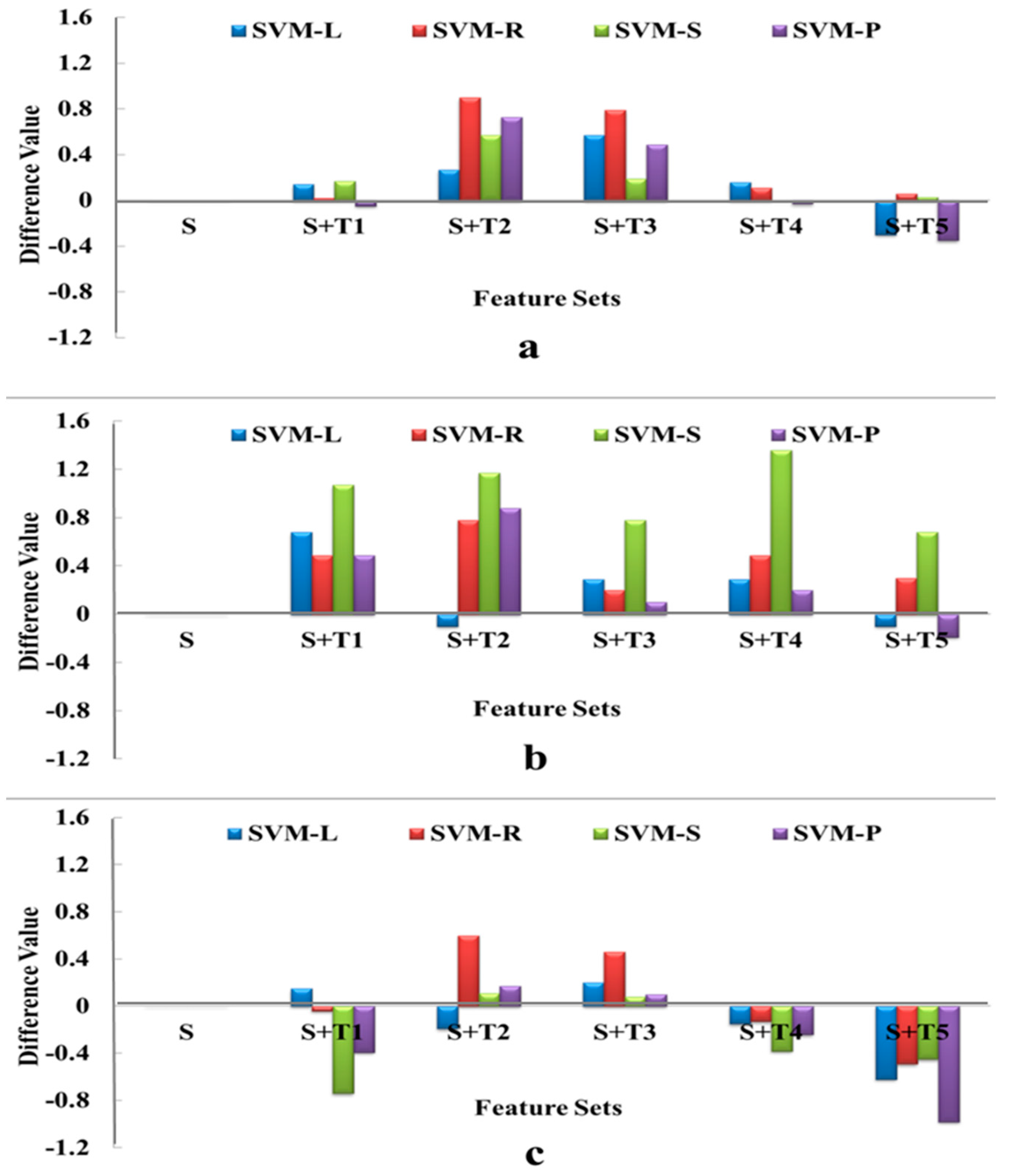 The accuracy changes of different kernel functions SVM using different feature sets: (a) the difference value of overall accuracy; (b) the difference value of producer accuracy; and (c) the difference value of user accuracy; Difference Value = Accuracy(S + T1/S + T2/S + T3/S + T4/S + T5) − AccuracyS).
