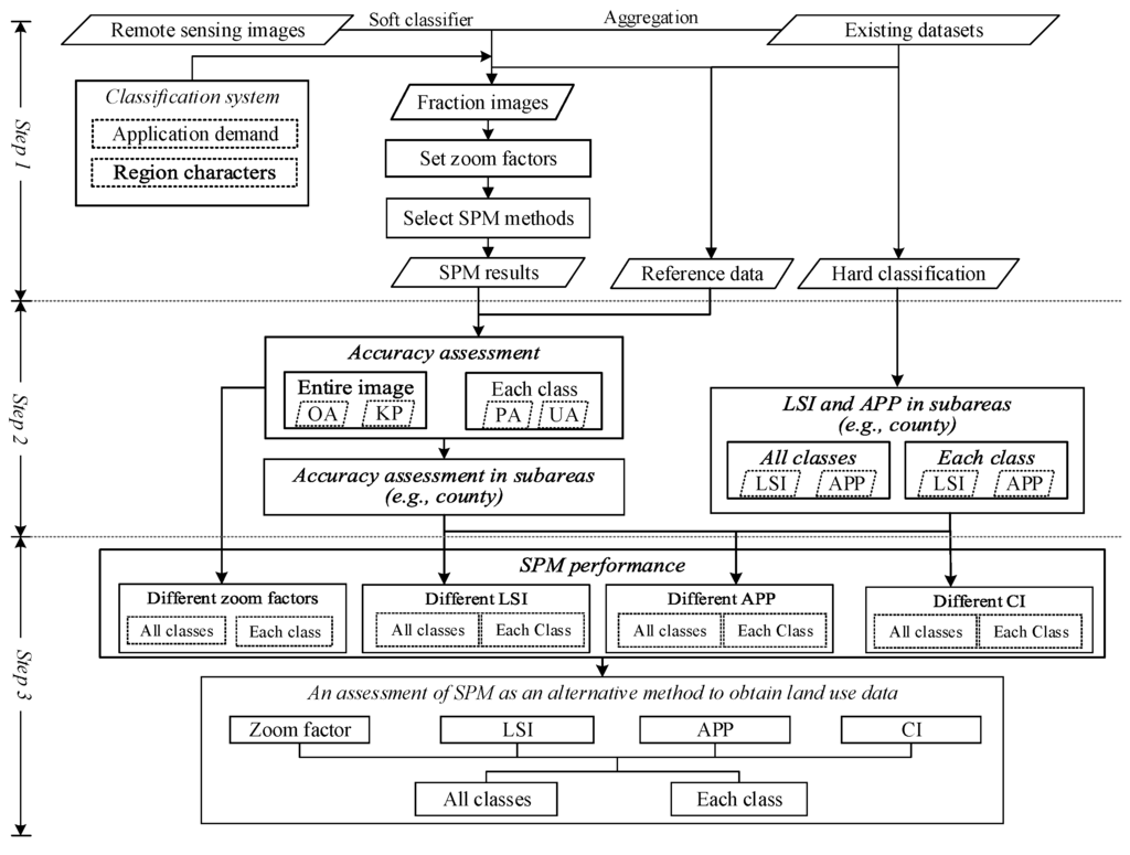 Figure 1. First, SPM is implemented to obtain finer-resolution LULC maps. The specific steps include the extraction of fraction images and reference data from remote sensing images or existing datasets, setting more than three zoom factors, and selecting at least two representative SPM algorithms to generate SPM maps. Second, the performance of the SPM is evaluated by analysis of the results, including accuracy assessment indices,