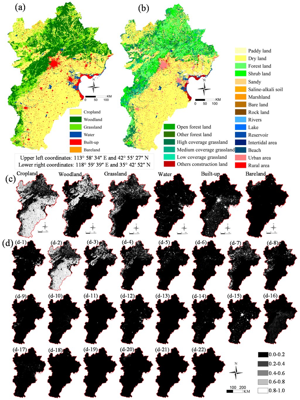 We distinguish two ways to obtain fraction images: soft classification from real remote sensing images and generation from existing LULC datasets such as upscaled data from high spatial-resolution classification data. For real remote sensing images, soft classification uses a classifier, such as a Bayesian or a support vector machine soft classifier, to directly generate fraction images with values ranging from 0 to 1 that indicate the proportion or possibility of pixels belonging to each class. Another way to extract fraction images is to aggregate existing classification data to simulate the output of soft classification, such as the Resources and Environmental Scientific Data Center of the Chinese Academy of Sciences [