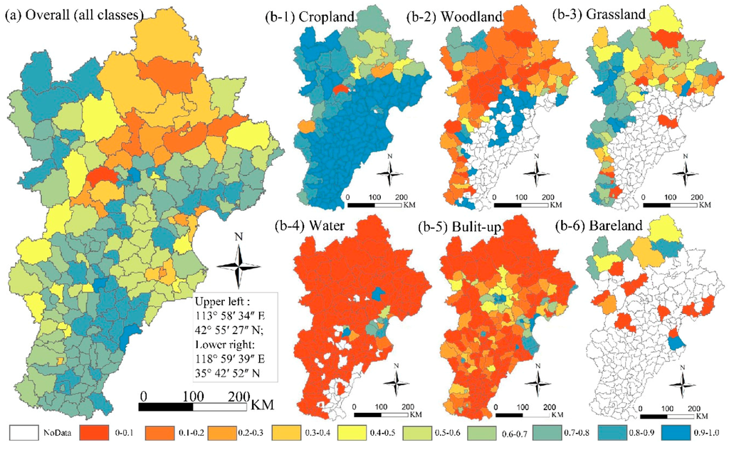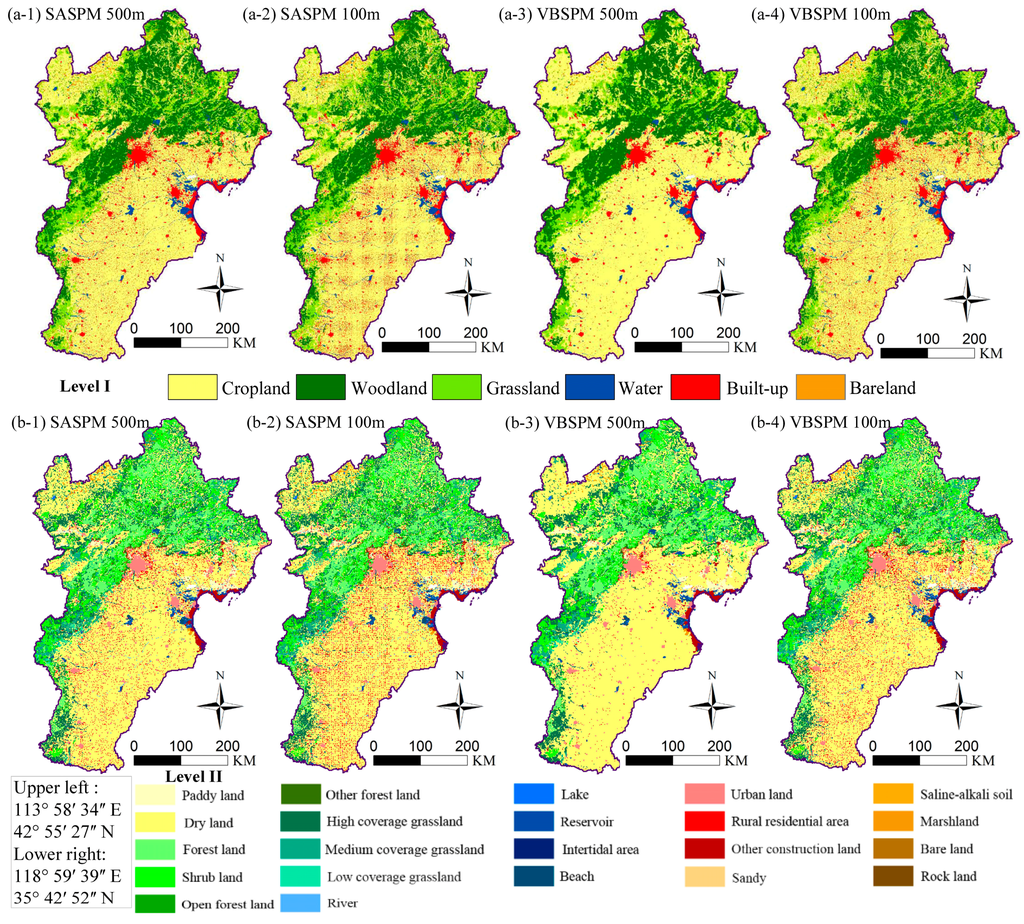 Using the 1-km synthetic fraction images, the SPM methods based on the assumption of spatial dependence are able to produce land use maps at subpixel scales, with OA values of 77%–85% and 75%–83% for the six classes at Level I and 22 classes at Level II, respectively, over the large area of Jingjinji region in China. These accuracies decline with the increase of S, and stabilize at an OA of approximately 78% at Level I and 75% at Level II, when the zoom factor reaches five. The two SPM methods produce the highest accuracy for areal pattern classes (e.g., cropland, woodland, and grassland), medium accuracy for linear pattern classes (e.g., water), and the lowest accuracy for point pattern classes (e.g., bare land and built-up areas). In the subareas (i.e., counties), less complex areas exhibit higher accuracy; i.e., subareas with high LSI values have lower accuracy, and subareas with LSI values of <18 generate SPM results with OAs of >80%.