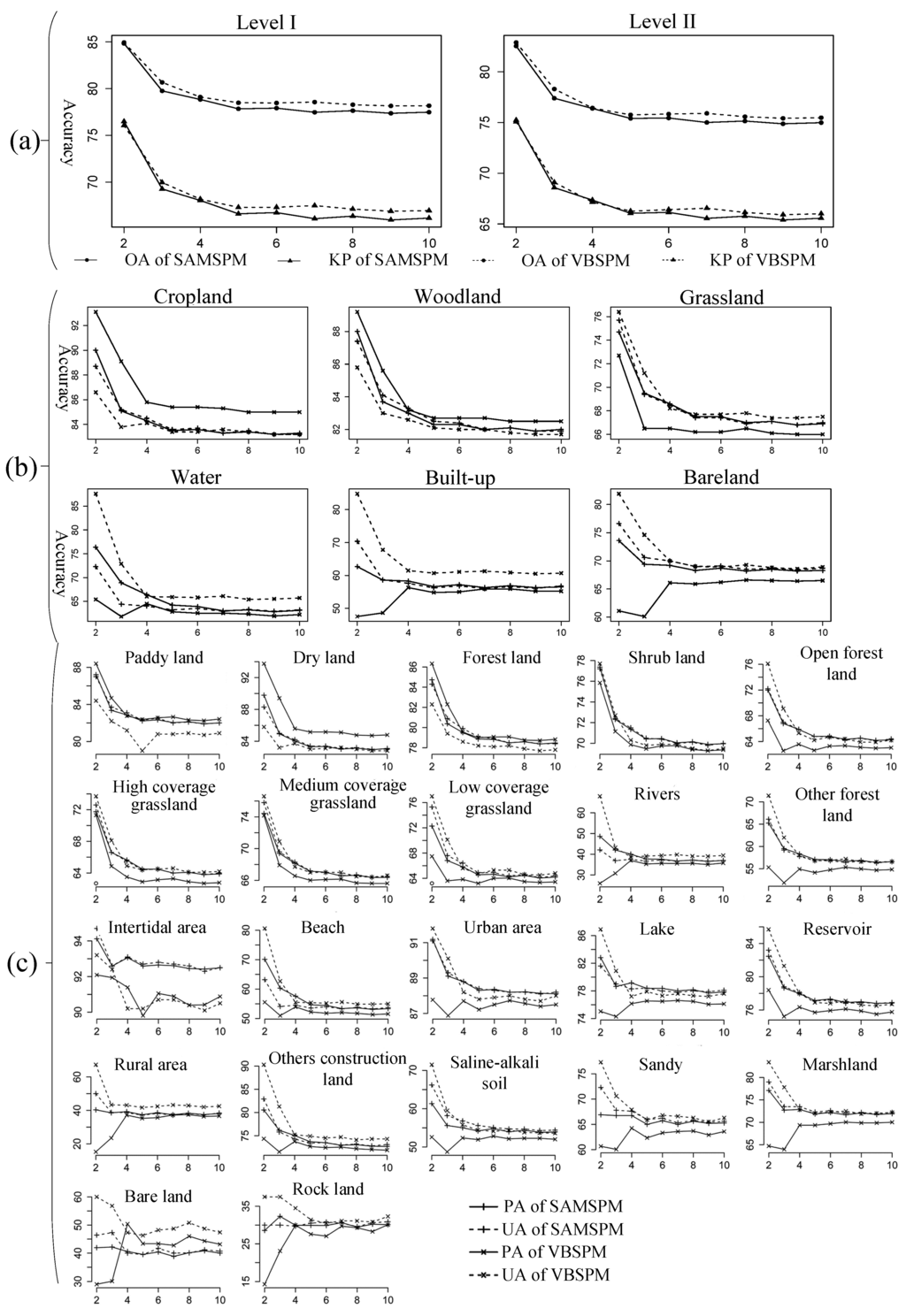 Figure 10). VBSPM produces slightly better results with greater OA (range: 0.3%–1.1%) than SAMSPM. VBSPM, however, generates results for built-up areas at Level I and rivers, rural areas, and rock land at Level II that are slightly less accurate (<1%) than SAMSPM with a low zoom factor (<4). This is because these classes do not represent H-resolution cases, for which VBSPM is most applicable [
