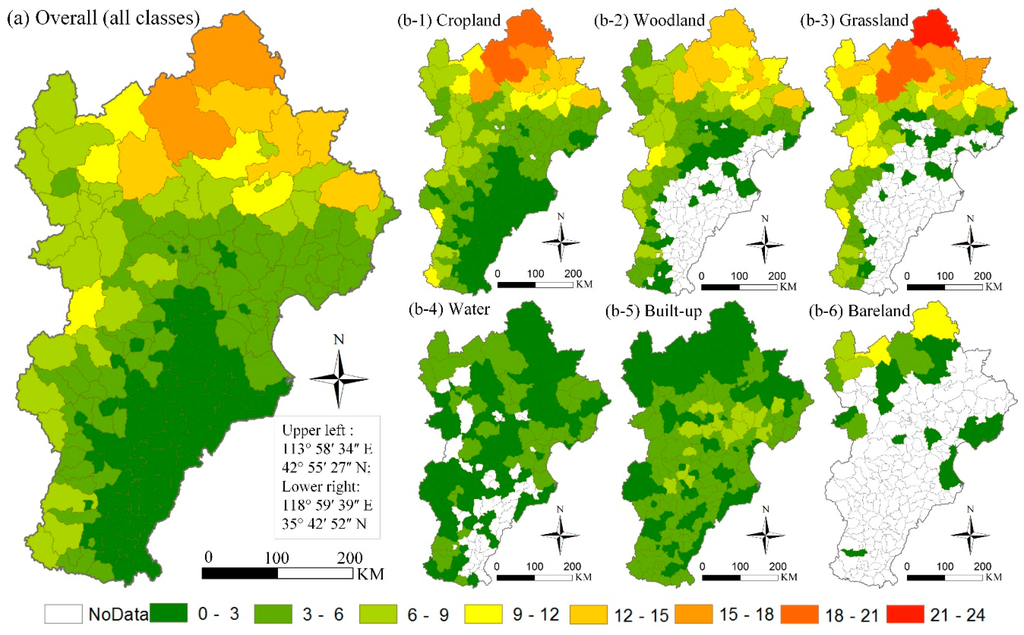 31]. Generally, however, these articles have focused on the development of SPM methods and performed relatively well. Little if any consideration has been given to whether SPM could feasibly provide alternative LULC data in practical applications for large and complex regions where high-resolution LULC maps are lacking. Moreover, no research has examined how landscape heterogeneity [