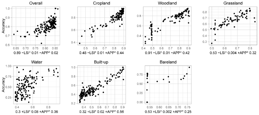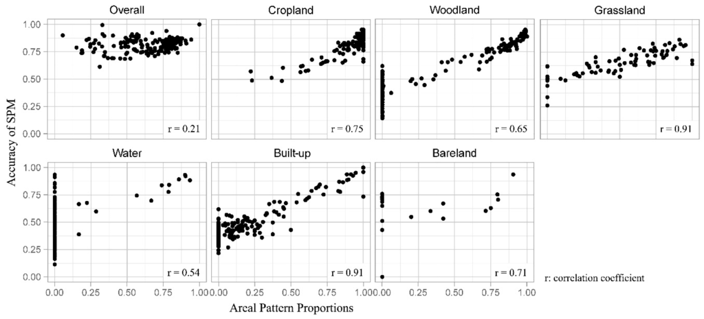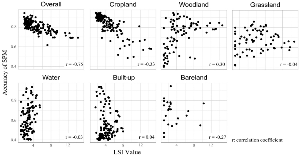 The spatial distribution of measurements calculated in subareas could be used to analyze SPM performance with different LSI values. The change of accuracy with LSI value can be illustrated using a scatterplot of measurements in subareas, where the LSI value is plotted as the x-axis and the accuracy assessment, such as OA and PA, is plotted as the y-axis. The accuracy assessment for different LSI ranges and the correlations between LSI and the accuracy assessment are calculated to explore the relationship between accuracy and LSI.