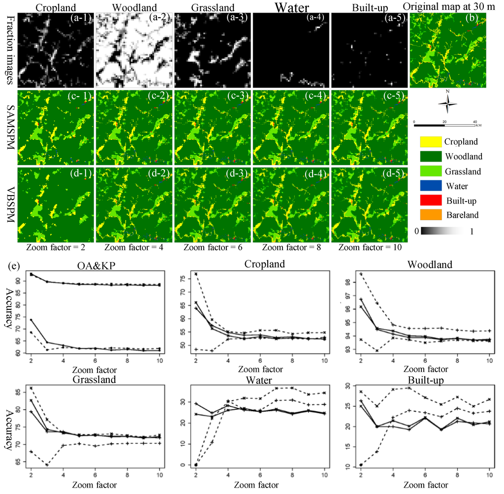 This study shows that OA and KP generally decrease as the spatial resolution of the SPM results becomes finer with the increase of the zoom factor. The reason for this can be attributed to the increase in the number of subpixels within a coarse pixel as the zoom factor increases; thus, greater uncertainty is generated regarding class allocation of the subpixels [