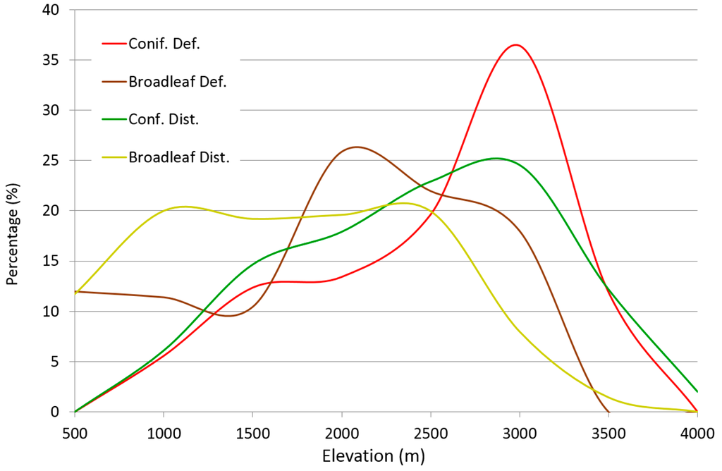 The current study provides spatially and temporally differentiated forest cover changes for 137 sub-districts (Tehsils) for two time periods: 1990–2000 and 2000–2010. Based on the extent of forest cover and the respective deforestation rates in each sub-district, the deforestation hotspots have been identified (Figure 3) and the top three degraded sub-districts are ranked within each administrative unit (Figure 4). In terms of forest types, dry temperate forests in the Malakand area and sub-tropical forest in the Waziristan area are under severe threat. In terms of elevation, broadleaf forests mainly occur between 1000–2500 m, with deforestation occurring at approximately 2000 m, whereas coniferous forest primarily occur between 1500–3500 m, with deforestation occurring at approximately 3000 m (Figure 5).