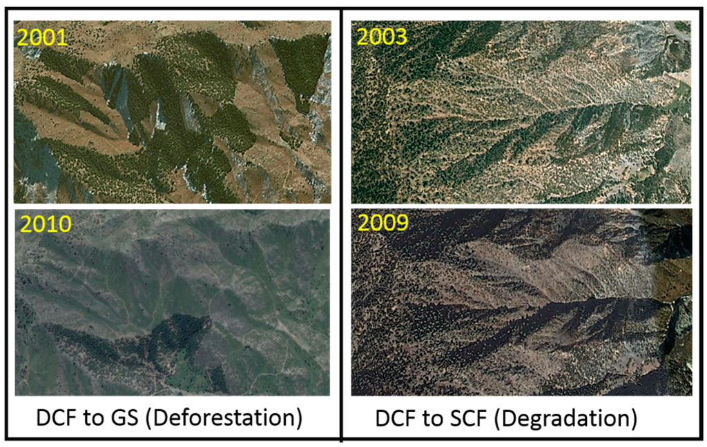 The land cover was primarily classified into 14 classes (Table 1), including six forest cover classes (i.e., dense coniferous forest, sparse coniferous forest, dense mixed forest, sparse mixed forest, sparse broadleaved forest) and eight non-forest cover classes (i.e., grassland/shrubs, alpine grassland, agriculture, bare soil/rocks, snow/glaciers/ice, water bodies). The transition from forest to non-forest was considered to be deforestation and dense forest to sparse forest was considered to be degradation. We employed FAO’s definition of deforestation which does not distinguish natural loss of forest from that caused by human action [53,54].