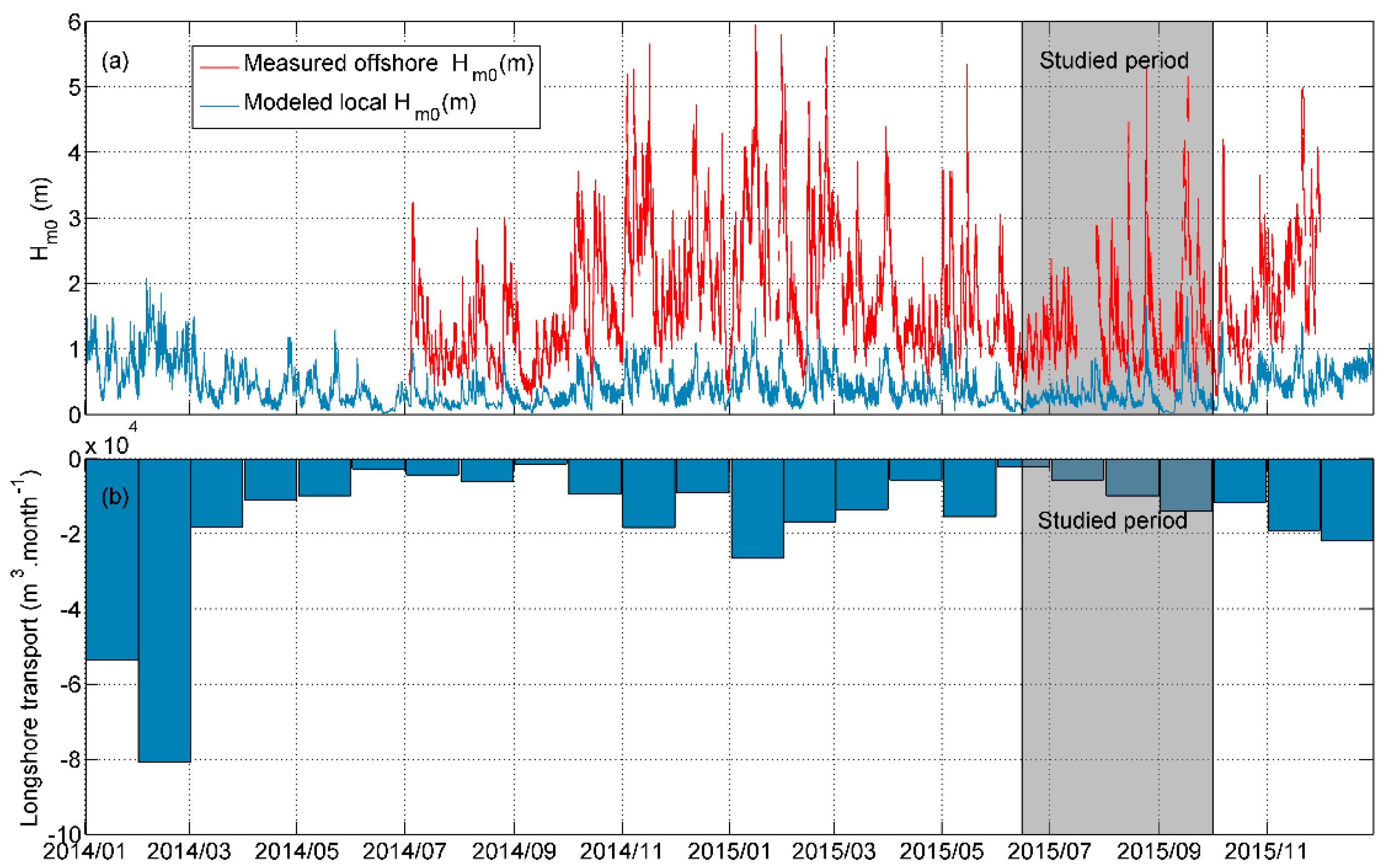 - Bertin, X.; Castelle, B.; Chaumillon, E.; Butel, R.; Quique, R. Estimation and inter-annual variability of the longshore transport at a high-energy dissipative beach: The St Trojan beach, SW Oléron Island, France. Cont. Shelf Res. 2008, 28, 1316–1332. [Google Scholar] [CrossRef]