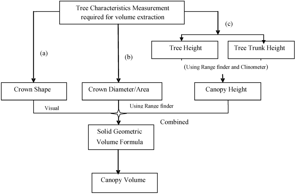 The relationships between canopy volume and several tree dimensions such as diameter at breast height, tree height, and crown shape are often used for estimating canopy volume. Allometric equations are commonly developed that predict tree and canopy volume as well as the biomass of several tree components from either diameter at breast height (DBH), tree height or both [9,10]. Figure 1 represents the work flow for the calculation of canopy volume based on manual measurements of several tree dimensions (Figure 2) in the field.