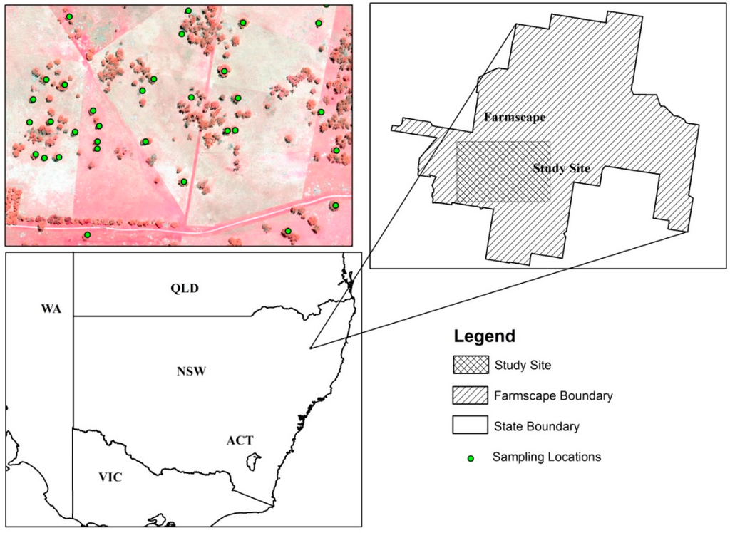 The study area was the ‘SMART’ farm [48] owned and operated by the University of New England (UNE), Armidale, New South Wales, Australia (longitude 151°35′40′′E to 151°37′12′′E and latitude 30°26′09′′S to 30°25′12′′S; Figure 3). With a total area of 4837 ha, the farm includes large tracts of natural forest cover with several Eucalyptus species, namely Apple Box (Eucalyptus bridgesiana), Stringybark (Eucalyptus caliginosa), Red Gum (Eucalyptus blakelyi), White Gum (Eucalyptus viminalis) and Yellow Box (Eucalyptus melliodora), and is partitioned into grazed and ungrazed areas of woodland and open pasture. Approximately one third of the area is forested; a third is woodland, and the remainder native pasture. Most of the property is managed in an agriculturally unmanipulated manner other than grazing. Most of the study area is unfertilized or little fertilized natural pasture grazed by sheep. The portion of the study area chosen for the collection of laser and ground datasets was approximately 200 ha (study site, Figure 3), limited in size by the LiDAR data acquisition footprint.