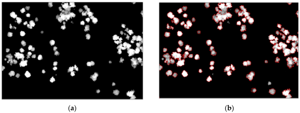 The automatic extraction of crown parameters from LiDAR was a two-step process involving (i) Canopy Height Model generation (CHM); and (ii) segmentation of the CHM image into homogeneous objects representing individual tree canopies. The CHM generation was carried out using interpolated two grid inputs, namely a Digital Terrain Model (DTM) and a Digital Surface Model (DSM) of 1 m spatial resolution. The DTM was a digital representation of the topographic surface where the height values in the terrain were known [50]. DSM was a representation of the features above ground level. A canopy height model, also referred to as a normalized digital surface model (nDSM), was created by subtracting the DTM from the DSM. The vertical resolution of the CHM was important as extraction of the tree height information largely depended on the accuracy of the CHM. The LiDAR data set for this study had a vertical accuracy better than ±30 cm (at 95% confidence level) and horizontal accuracy better than ±80 cm (at 95% confidence level). Since both the DTM and the DSM were created using interpolation, and given the additive nature of the vertical errors from a number of contributing processes in calculating the CHM, this yields a vertical error of approximately 1 m. The processing was done in ArcGIS version 10. The image segmentation (Object based classification) software used to extract trees from the CHM was eCognition (eCognition Developer 8, Munich, Germany, GmbH), which offers a wide range of segmentation algorithms. Segmentation is the critical first step in object based classification, and reduces the image into discrete regions or objects that are homogeneous with regard to spatial or spectral characteristics [51]. The image segmentation was carried out using the ‘fractal net evolution approach’ (FNEA), which relies on using a set of user-defined parameter settings, which affects the segmentation results [52,53]. The important outcome of the segmentation process is to identify objects that are representative of the features. The derived CHM was a grid in a single band image with the objects partitioned into lighter and darker areas. Therefore, a ‘contrast split’ segmentation algorithm in eCognition was employed for tree extraction. The algorithm splits bright and dark objects in image based on a threshold that maximizes the contrast between the resulting bright objects (pixel values above threshold) and dark objects (pixel values below the threshold). The algorithm evaluates the optimal threshold separately for each image object in the image object domain (set of image objects). Firstly, the algorithm executes a chessboard segmentation (splits the pixels domain into a square image object), and then performs the split on each square. Secondly, to optimize this separation, the algorithm considers different pixel values as a potential threshold, within the range provided by the user parameters and with values selected based on the input step size and stepping parameter. The test threshold causing the largest contrast is chosen as the best threshold and used for splitting. The test thresholds range from the minimum threshold to the maximum threshold, with intermediate values chosen according to the step size (the sizes of steps used by the algorithm to move from the minimum threshold to the maximum threshold), and step parameters calculate each step by addition or multiplication (the value is either added to the threshold or multiplied by the threshold). Finally, the mean of possible bright and dark border pixels is used to calculate either the edge ratio or edge difference, which is then used to define the contrast between two objects. The selection of segmentation parameters was highly subjective and determined through a combination of trial and error, and ultimately user experience [47]. For this study, a minimum and maximum threshold of 20 and 110, respectively, a step size of 5, and an add function for the stepping type parameter was found suitable and effective for tree extraction. Figure 5 shows the different steps of contrast split algorithm used in the study and Figure 6 shows the segmented objects.