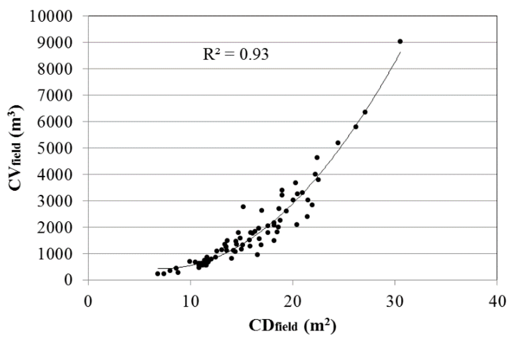 Scatterplot between canopy volume (CVfield), calculated using Equation (1), and measured crown diameter (CDfield). The solid curve is the best-fit, polynomial regression equation.