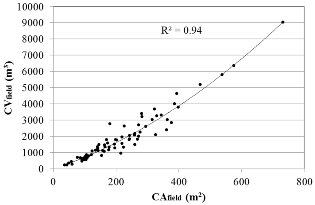 Scatterplot between canopy volume (CVfield), as calculated using Equation (1), and measured crown projected area (CAfield) derived from field measurements. The solid curve is the best-fit, polynomial regression equation.