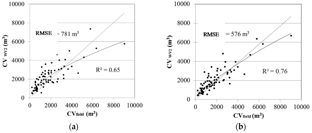 Scatterplots of canopy volume from WV2 using (a) crown projected area (CA); and (b) crown diameter (CD) with crown volume (CV) as the predictor variable from field measurements. The dashed lines are the 1:1 equivalence between measured and predicted values and the solid lines the best-fit regression curves (power and polynomial, respectively).