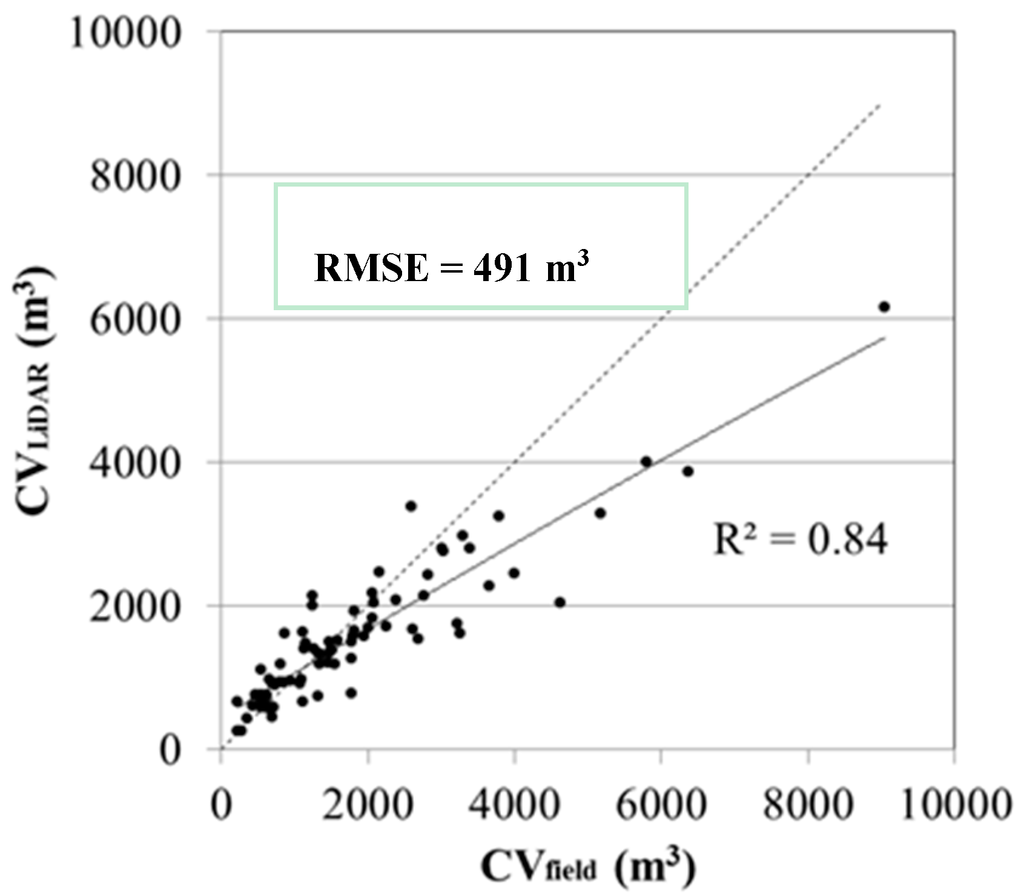 Figure 10 shows the scatterplot of LiDAR-derived canopy volume versus field-measured CV. CVLiDAR was calculated from Equation (1) using both canopy height and crown diameter derived from the LiDAR data. Despite the lower RMSE for the LiDAR-derived canopy volume estimates (490.8 m3, 26% error), CVLiDAR systematically underestimated CVfield at larger canopy volumes (>4000 m3).