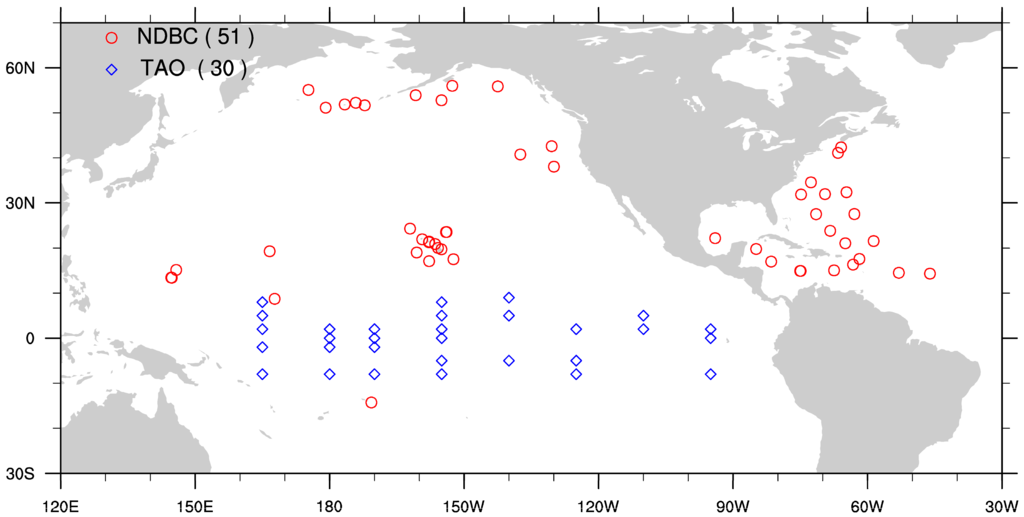 Wind observations during the 36-month observation period (2012–2014) were obtained from 51 moored buoys operated by the National Data Buoy Center (NDBC) [47] (also see www.ndbc.noaa.gov) and 30 moored buoys operated by the Tropical Atmospheric Ocean (TAO) project. The locations of these buoys are shown in Figure 1. Most of the NDBC buoys are 3-meter discus buoys, with an anemometer height of 5 m above sea level. The TAO wind observations (see http://tao.ndbc.noaa.gov) include 20 Autonomous Temperature Line Acquisition System (ATLAS) buoys with 4 m height from and 10 Triangle Trans Ocean Buoy Network (TRITON) buoys with 3.5 m height. In order to make the buoy data comparable with scatterometer data, all of the buoy winds were converted to 10-m neutral winds using the LKB model [48,49].