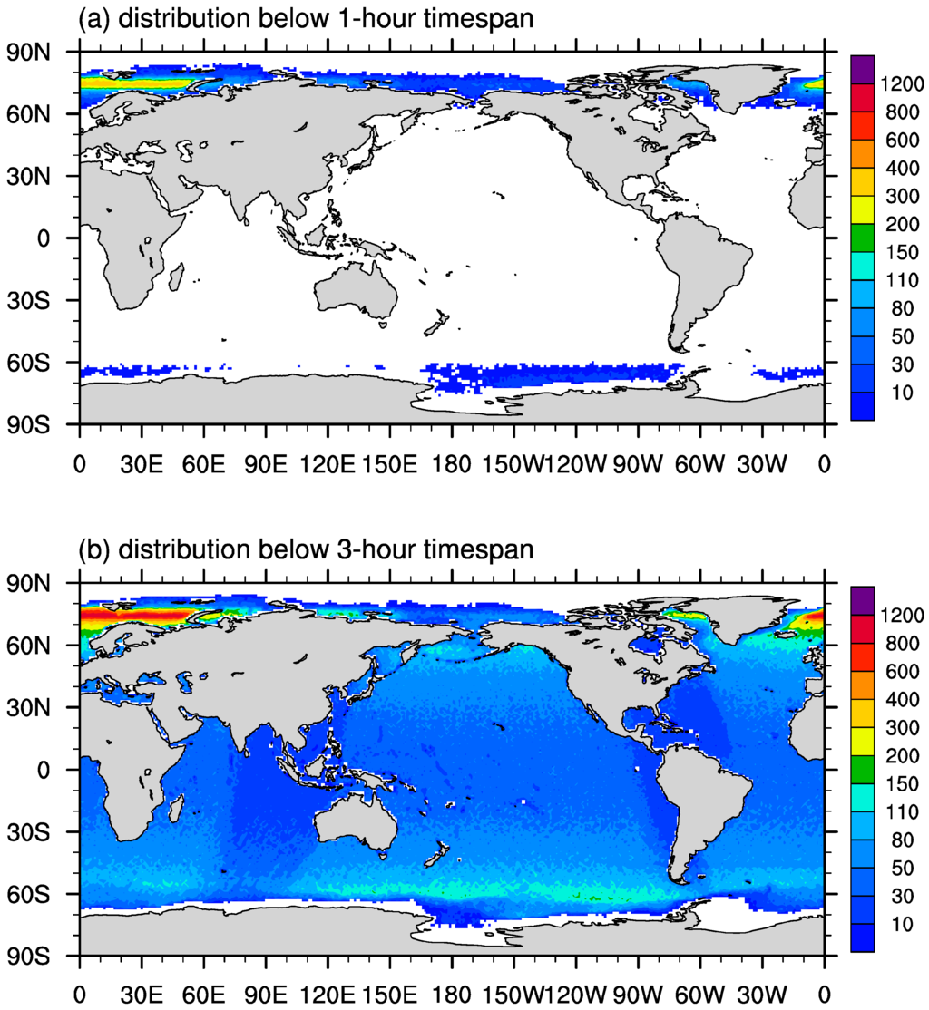 Number of collocated HY-2A Scatterometer (H2SCAT) and the advanced scatterometer (ASCAT) with below 1-h (a) and 3-h (b) timespans on 1° × 1° grid.