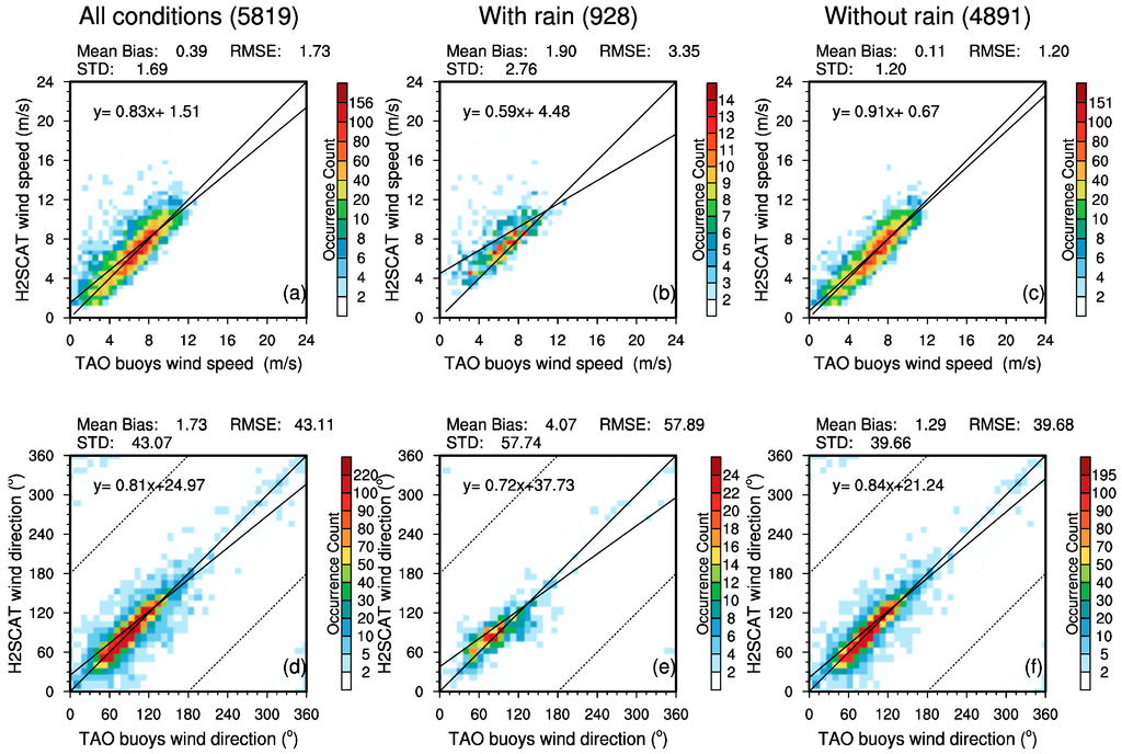 The linear regression coefficients of the wind directions between H2SCAT and TAO are about 0.8. H2SCAT shows a slightly positive bias ~1.73°, reducing to 1.29° under rain-free conditions. Under all-weather conditions, most of the H2SCAT wind directions were in good agreement with the TAO buoys, and the overall RMSE was 43.11°. The RMSE increased to 57.89° under rainy conditions, and reduced to 39.68° without rain. Under rainy conditions, the linear regression coefficient of the wind direction between H2SCAT and TAO reduced to 0.72 with an intercept of 37.73°. In general, rain increases the uncertainty in both the speed and direction of wind. The effects of rain on wind vector retrievals are obvious and consistent with those of the SeaWinds scatterometer [38].
