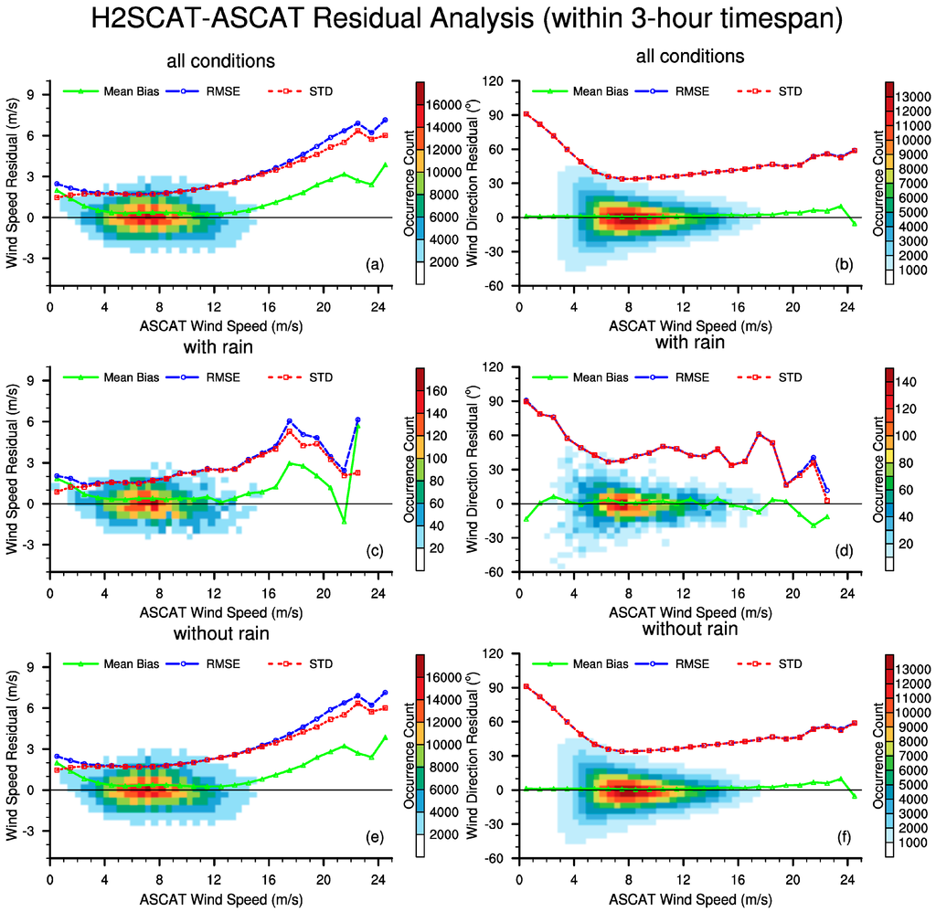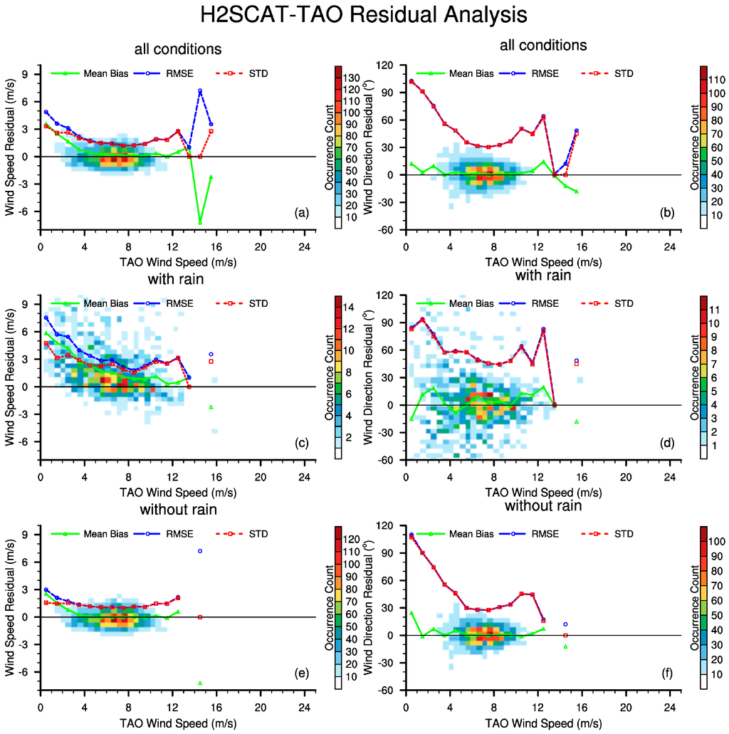 Residuals (H2SCAT-TAO buoys) of wind speeds (left) and wind directions (right) under all-weather, rain and rain-free conditions, calculated in 1 m·s−1 wind speed bins of TAO buoys. Green, blue and red lines represent the mean bias, the root mean square error (RMSE) and the standard deviations (STD), respectively. The raster colors represent residual distributions in 2-D wind-speed bins of 0.5 m·s−1 × 0.5 m·s−1 and wind-direction bins of 0.5 m·s−1 × 5°.