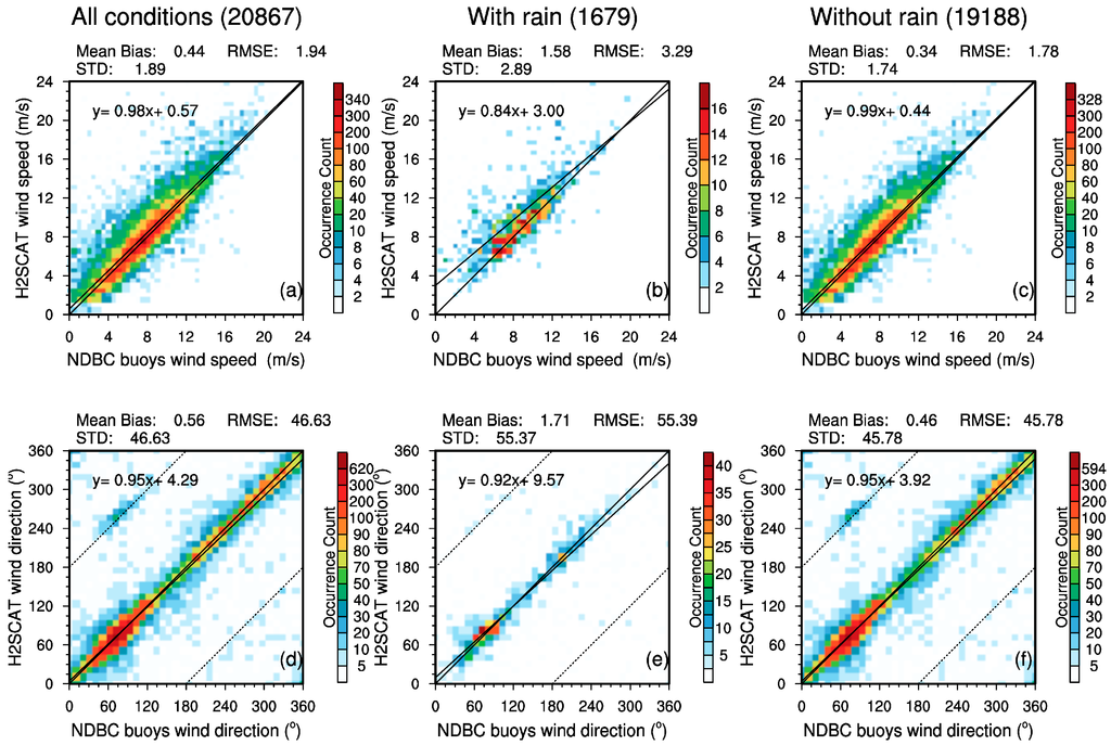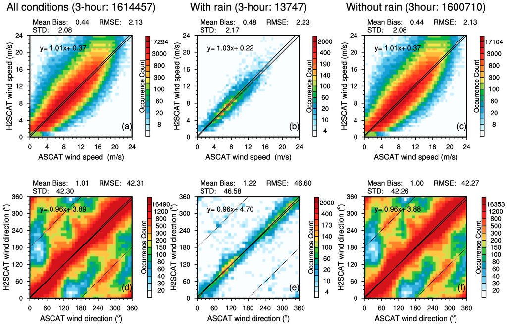 In order to check the difference between the two SCATs beyond the Polar zone, we use the 3-h collocations and discard the pairs located outside of 60°S–60°N. Figure 11 presents the 2-D histograms of wind speed and direction between ASCAT and H2SCAT within 3-h timespan. Unlike the comparison of 1-h timespan, the wind speed mean bias and RMSE increased to 0.44 and 2.13 m·s−1 under all conditions, however, the wind direction decreased to 42.31°. The degradation of wind speed was probably due to the expanded time interval, and the improved wind direction was caused by geographical position change. Under rain conditions, the mean bias and RMSE of wind speed and direction increased a little from 0.44 and 2.13 m·s−1 to 0.48 and 2.23 m·s−1 and from 1.01 and 42.31° to 1.22° and 46.6° respectively. The performance under rain-free are similar with all conditions, because of the number of collocations without rain is far more than with rain.