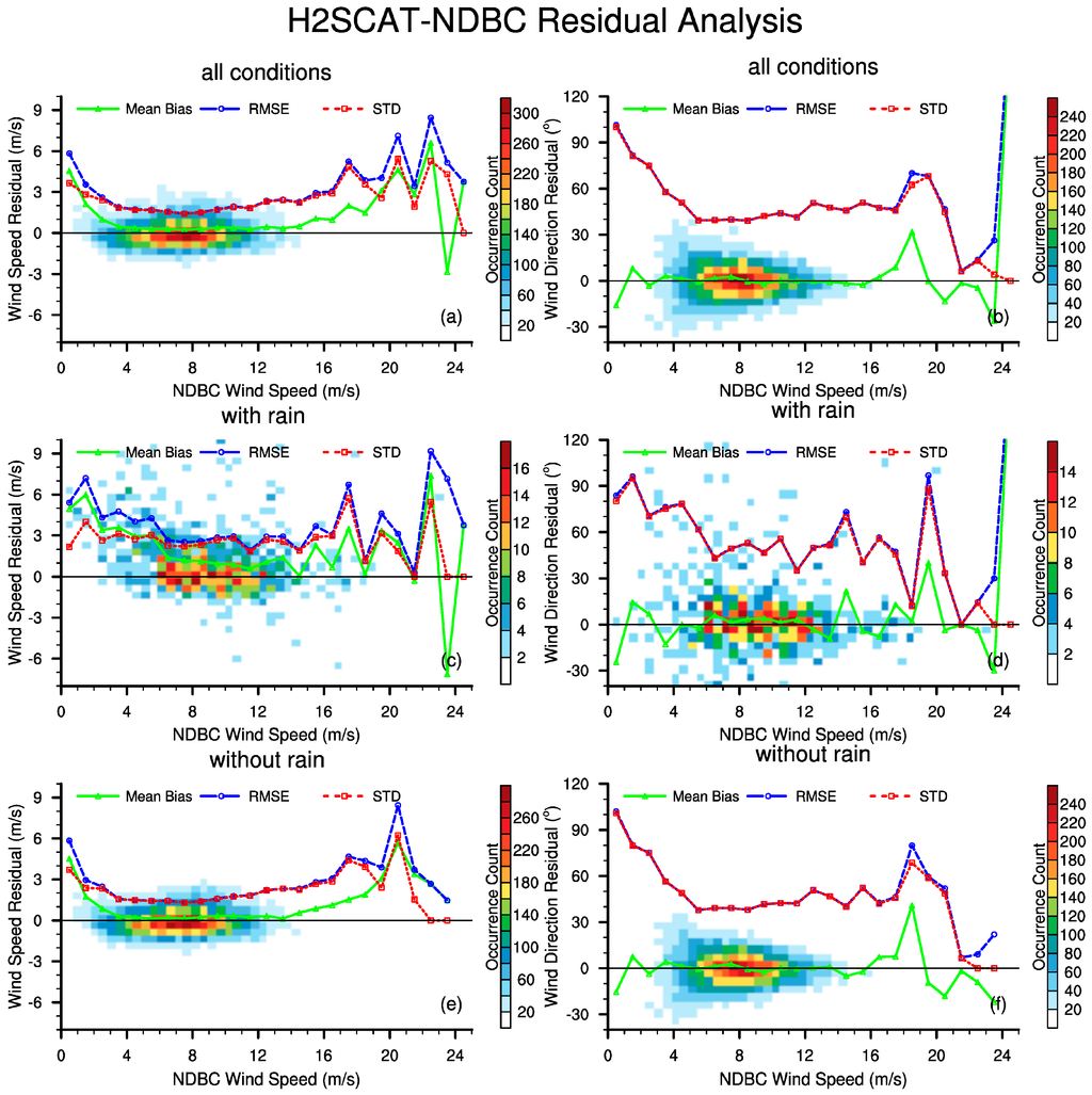 Residuals (H2SCAT-NDBC buoys) of wind speeds (left) and wind directions (right) under all-weather, rain and rain-free conditions, calculated in 1 m·s−1 wind speed bins of NDBC buoys. Green, blue and red lines represent the mean bias, RMSE and STD, respectively. The raster colors represent residual distributions in 2-D wind-speed bins of 0.5 m·s−1 × 0.5 m·s−1 and wind-direction bins of 0.5 m·s−1 × 5°.