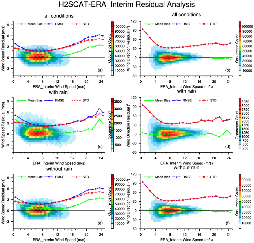 Figure 8 plots the residuals (H2SCAT-ERA-Interim) under the all-weather, rain and rain-free conditions. The residuals of all collocated pairs are similar to those under rain-free conditions. Table 3 summarizes the statistical parameters of wind speed and direction between H2SCAT and ERA-Interim reanalysis under the all-weather, rain and no-rain conditions. The wind speed biases were about 0.5 m·s−1 in the moderate speed range (4–13 m·s−1), where more than 90% of the data are located. The biases enlarged to 2.7–3 m·s−1 at lower (<4 m·s−1) and higher (>13 m·s−1) wind speeds. The STD decreased from 2.5 to 1.8 m·s−1 as the wind speed increased from 0 to 6 m·s−1, but increased to more than 4.0 m·s−1 at high wind speeds (>13 m·s−1). The wind direction shows almost no mean bias. The STD was below 40° at moderate wind speeds (4–13 m·s−1) and slightly increased at high wind speed (>13 m·s−1). The STD reached as large as 90° at low speed range (<4 m·s−1).