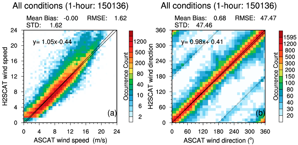 Figure 9 presents the 2-D histograms of wind speed and direction between ASCAT and H2SCAT within 1-h timespan. The H2SCAT show higher accuracy against the ASCAT data than under the buoy data in Figure 3 and Figure 5. The linear regression coefficients are as high as 1.05 for the wind speeds and 0.81 for directions. The wind speeds of both scatterometer data are consistent. The mean bias of the wind speed is almost zero, and the RMSE and STD both equal 1.62 m·s−1. However, the wind directions differ between the two datasets. Although the mean bias is small (0.68°), the RMSE and STD are relatively high (47.5°).