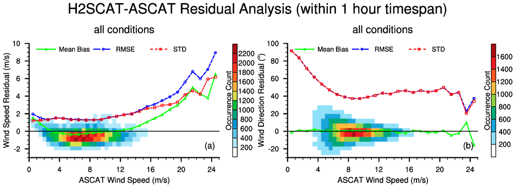 Residuals (H2SCAT–ASCAT, within 1-h timespan) of wind speed (a) and wind direction (b), calculated in 1 m·s−1 bins of ASCAT wind speeds. Green, blue and red lines represent the mean bias, RMSE, and STD, respectively. Raster colors represent residual distribution in 2-D bins of 0.5 m·s−1 × 0.5 m·s−1 for wind speed and 0.5 m·s−1 × 5° for wind direction.