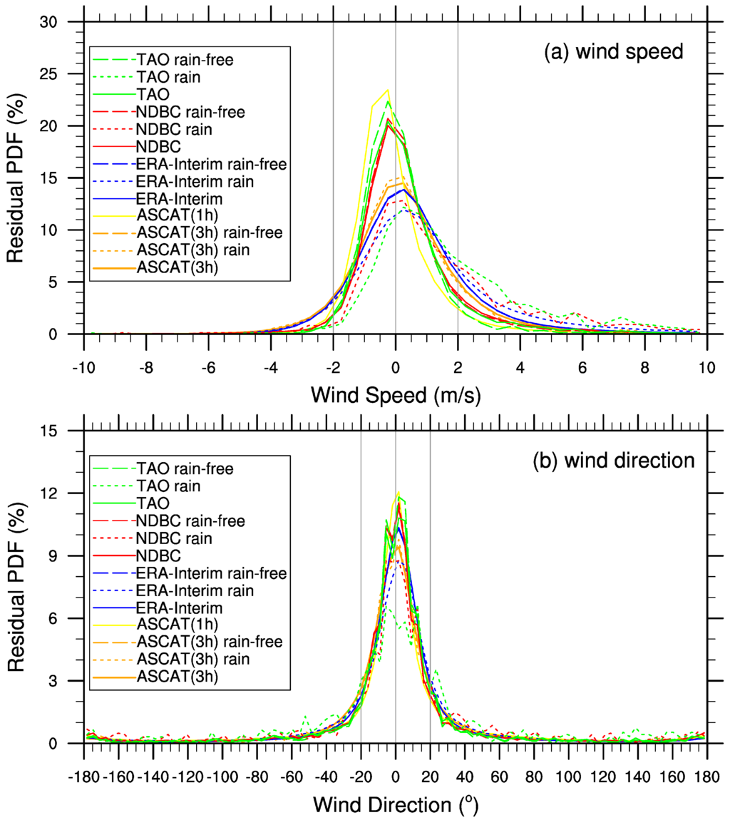 Precipitation exerted similar effects on the wind direction. Under rain condition, only 55.1%, 61.4%, and 65.8% of TAO, NCBC, and ERA-Interim distributions are located in the ±20° range. In total, 69%–73% of the collocated data pairs in different comparisons are located within the designed precision range of wind direction.