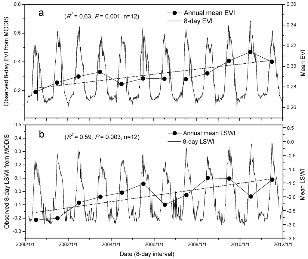 Long-term dynamics of (a) eight-day EVI, annual mean EVI; and (b) eight-day LSWI, annual mean LSWI derived from MODIS imagery during 2000–2011 in the Zoige alpine wetland. Dashed lines are the linear trends of annual mean EVI and LSWI, respectively.