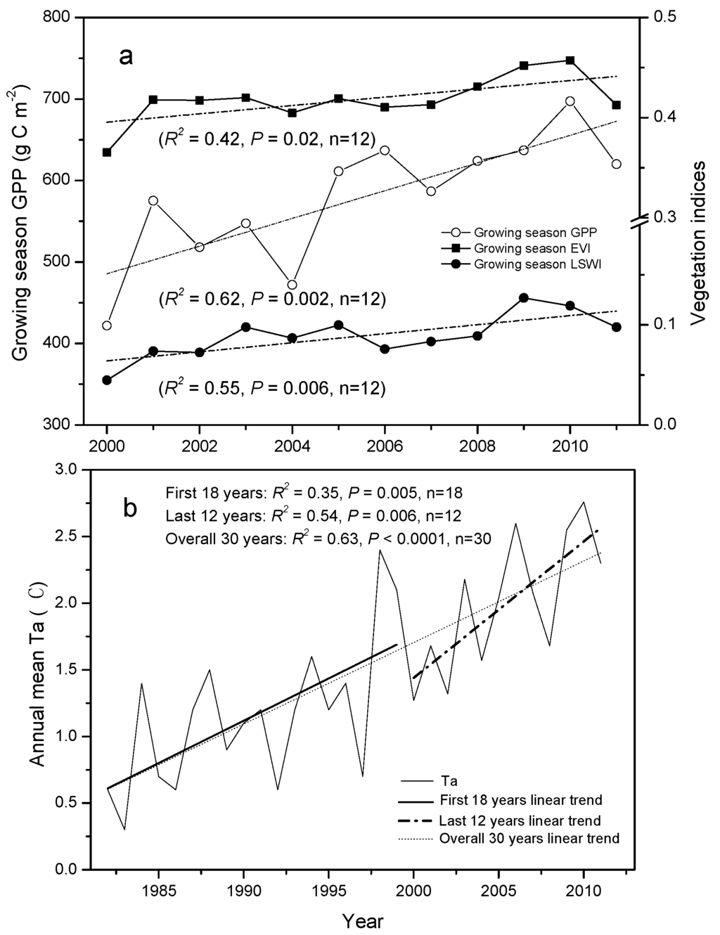 Long-term dynamics of (a) growing season GPP, mean EVI, and LSWI during 2000–2011; and (b) linear trends of mean annual temperature (Ta) for the overall 30-year (1982–2011), first 18-year (1982–1999), and last 12-year (2000–2011) periods. Dashed lines are the linear trends of growing season GPP, mean EVI, LSWI, and annual mean Ta, respectively.