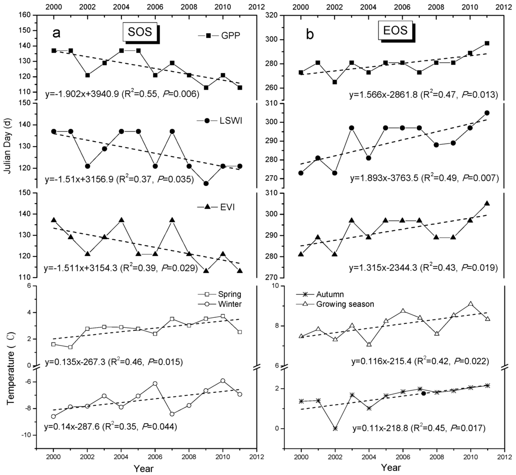 Interannual variation in (a) the start date of the growing season (SOS) and spring and winter temperatures; and (b) the end date of the growing season (EOS) and autumn temperature during 2000–2011 for the Zoige alpine wetland. The SOS and EOS were delineated by MODIS-based eight-day vegetation indices (EVI and LSWI) and simulated GPP by the VPM model. Dashed lines are the 12-year linear trend of SOS, EOS, and temperature. Spring: March to May; autumn: September to November; winter: December to February; growing season: May to September.