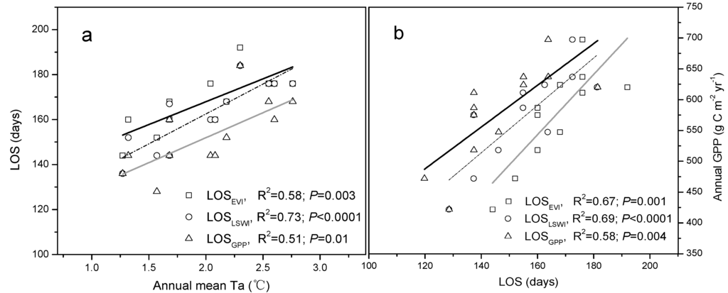 The relationships between the length of growing season (LOS) delineated by EVI, LSWI, and simulated GPP by VPM and (a) observed annual mean Ta and (b) annual GPP, respectively.