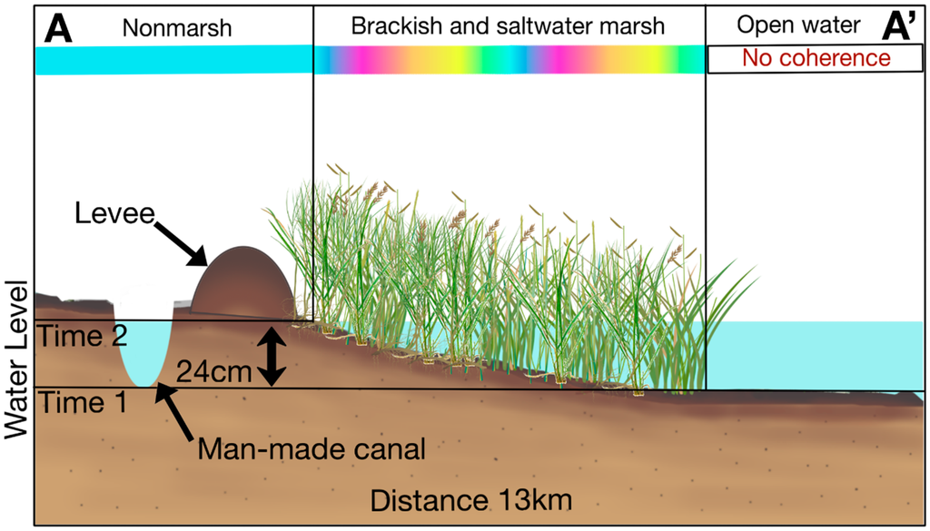 Disruptions along the Louisiana coast are major factors of wetland loss. Anthropogenic intervention is transforming coastal Louisiana, changing the natural tide interaction with the coast and changing the regular sediment deposition with it. The dredged canals that interrupt the water flow work as barriers that divide and separate the coastal wetlands. The dissected wetlands become more sensitive to sea level rise of 3.2 ± 0.4 mm/year [] and ultimately dying due to land subsidence and increasing sea level.