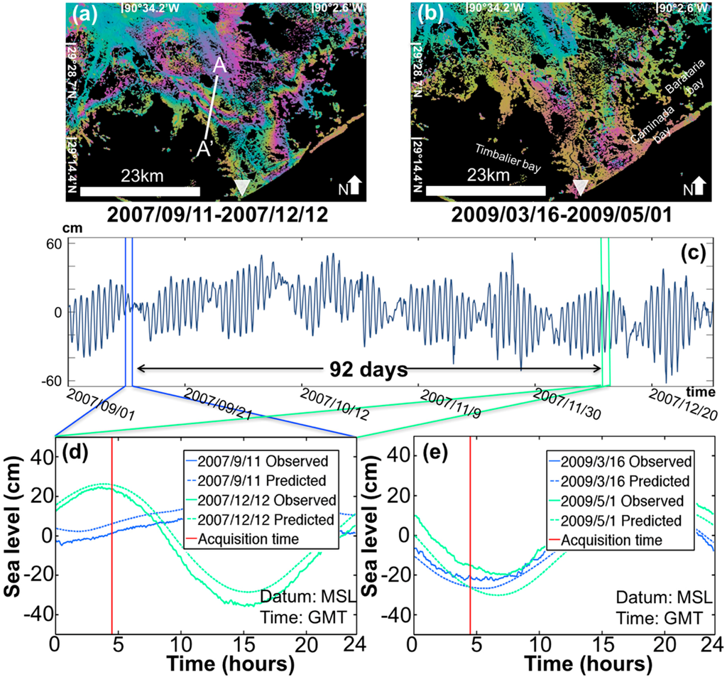 (a) ALOS interferogram of track 166 showing two fringe cycles across the tidal zone mapping the tide inundation extent. The white triangle marks the location of the Port Fourchon gauge station. The white line shows the location of the section described on Figure 7; (b) ALOS 16 March 2009–1 May 2009 interferogram of the same track showing no fringes; (c) Port Fourchon tide gauge data from 1 September 2007 to 31 December 2007. The blue and green vertical lines show the 24-h period recorded by the tide gauge for the two acquisition dates of interferogram (a); (d) Port Fourchon tide gauge predicted (solid) and observed (dashed) records plotted for 24-hour periods of the two acquisition dates (11 September 2007 in blue and 12 December 2007 in green). The red vertical line marks the ALOS acquisition time 4:32 GMT, which shows roughly 25 cm water level differences between the two acquisitions; (e) A similar tide gauge analysis for the two acquisition dates of the interferogram (b) showing only 5 cm of water level change between the two acquisition times.