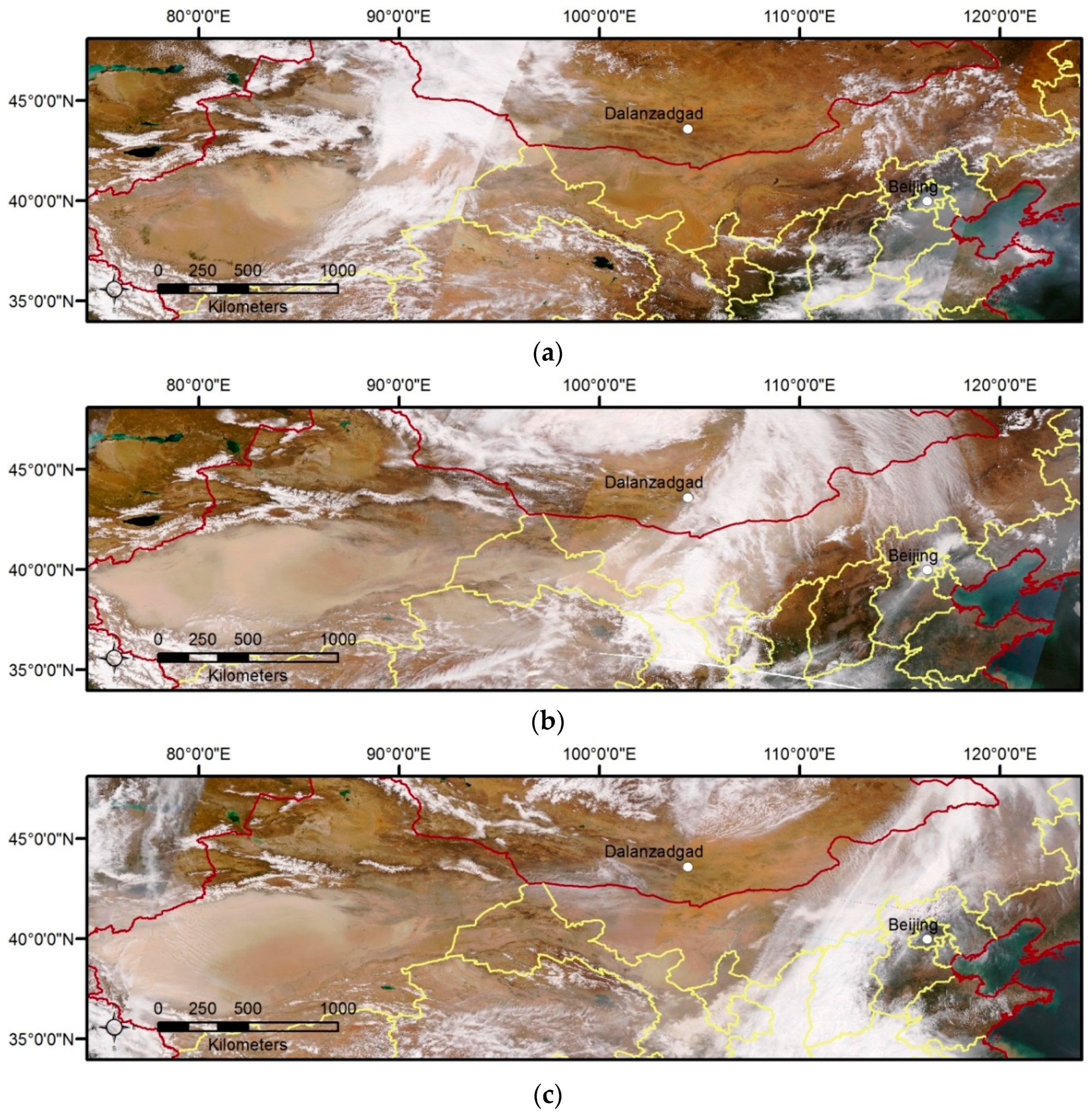 True color composite images of FY-3C MERSI over (a) north China on 23 April; (b) 24 April; and (c) 25 April 2014. The locations of Beijing (39.977°N, 116.381°E) and Dalanzadgad (43.577°N, 104.419°E) are marked with white circles.