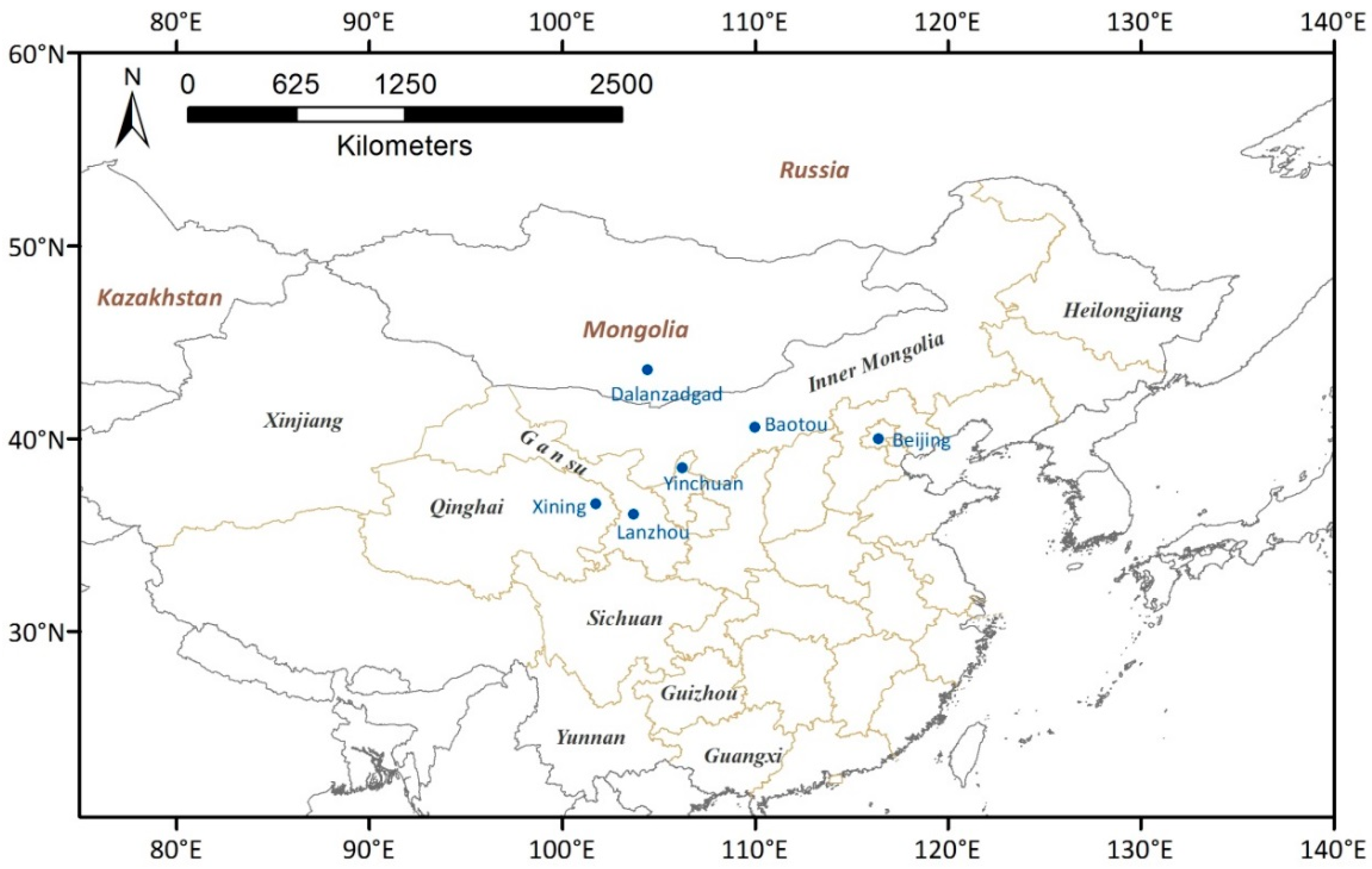 True color composite images of FY-3C MERSI over northeast Asia on several days during the dust storm (Figure 1) reveal highly turbid atmospheres and a significant amount of dust transported over the area. The geolocation information of the affected areas is shown in Figure 2.