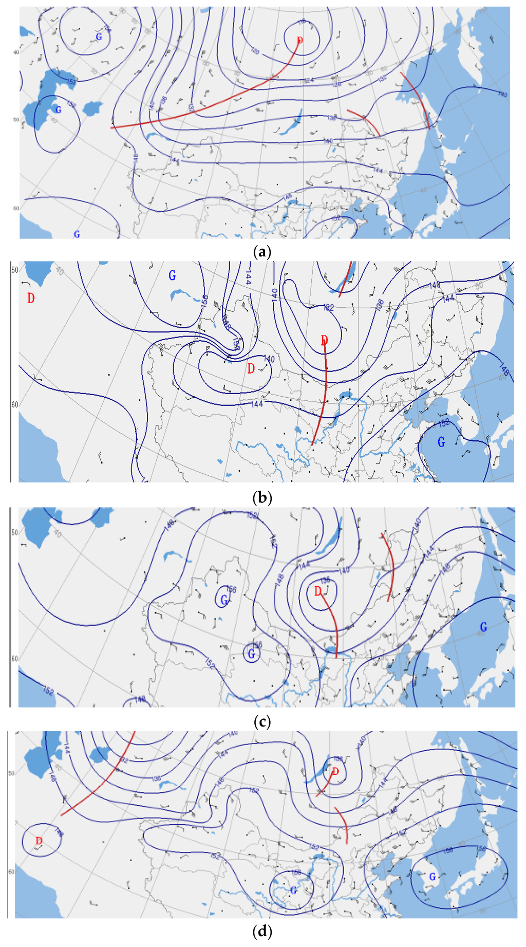 The 850 pressure field (hPa), 10-m wind vector field (m/s) at (a) 0000 UTC on 22 April; (b) 0000 UTC on 23 April; (c) 0000 UTC on 24 April and (d) 0000 UTC on 25 April. Wind direction is represented by a wind-direction shaft (vertical bar) with the end pointing to the wind direction. Wind speed is represented by the number of horizontal bars at the other end of the wind-direction shaft: one, 0.3–3.3 m/s; two, 3.4–7.9 m/s; three, 8.0–13.8 m/s; four, 13.9–20.7 m/s; five, >20.7 m/s. ”D” represents the low pressure center, whereas “G” represents the high pressure center. The value of the contour must be multiplied by a factor of 10 to represent the 850-hPa geopotential height.