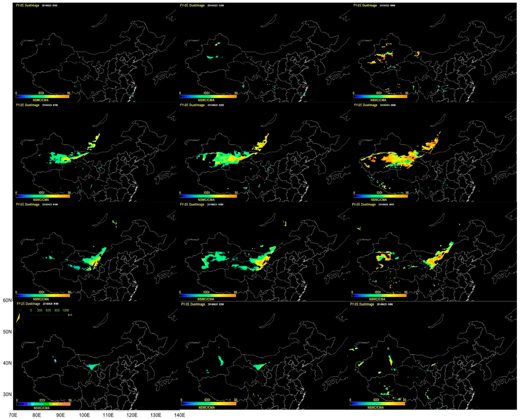 Figure 4 shows the dust identification IDDI images derived from FY-2E from 23 April–26 April 2014 at 01:00, 02:00 and 06:00 UTC. The study of IDDI is considered to reveal the breakout time and transport paths of the dust storm.