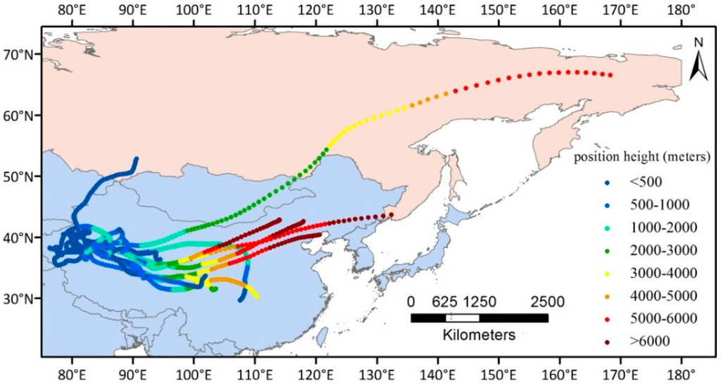 Forward air-mass trajectories are obtained via the HYSPLIT model [41] to reveal the transport pathways and vertical distributions of the dusty air masses. Four-day forward air mass trajectories starting from the Taklamakan Desert (39.51°N, 83.50°E) at 200 m above ground level during the dust storm are shown. The simulation results show the altitude variation along the dust transport path, which give important information of their possible interaction with the Atmospheric Boundary Layer (ABL). The interaction process favors the deposition of dust particles originating from the dust source. This analysis also helps to identify the downwind areas that were mostly affected by the dust storm.