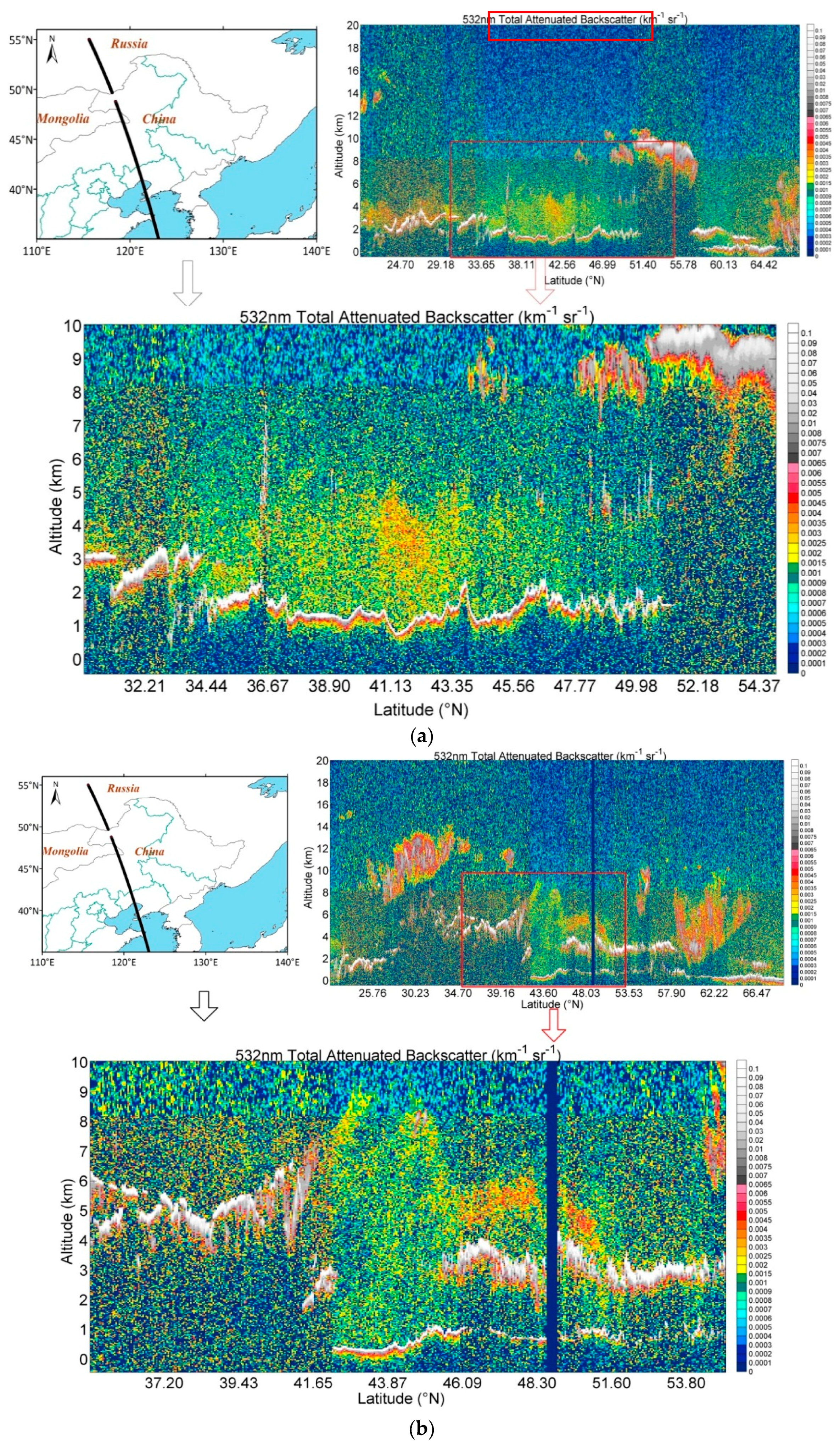 - Winker, D.M.; Hunt, W.H.; McGill, M.J. Initial performance assessment of CALIOP. Geophys. Res. Lett. 2007, 34, L19803. [Google Scholar] [CrossRef]