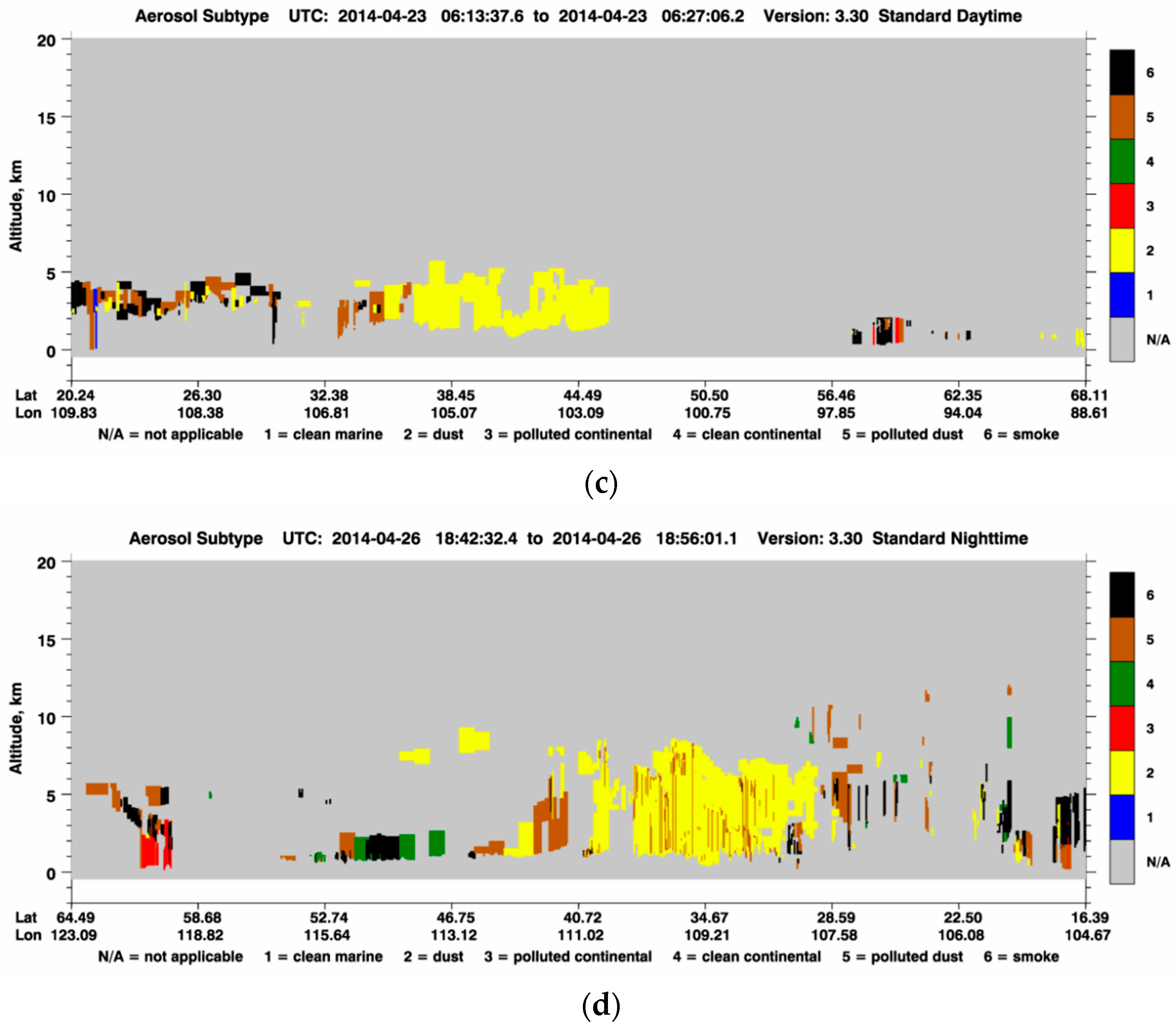 Total attenuated backscatter profiles at 532 nm on (a) 23 April 2014; (b) 26 April 2014 and aerosol subtype images obtained from CALIPSO observations on (c) 23 April 2014 and (d) 26 April 2014.