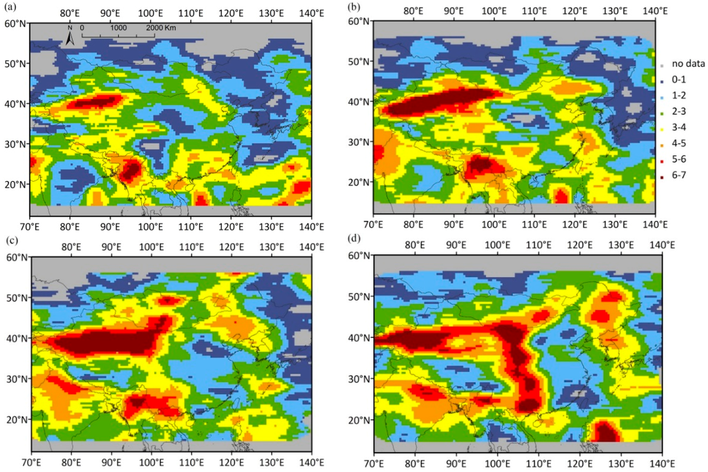TOU aerosol index over northeast Asia during the 2014 dust episode on (a) 22 April, (b) 23 April; (c) 24 April and (d) 25 April.