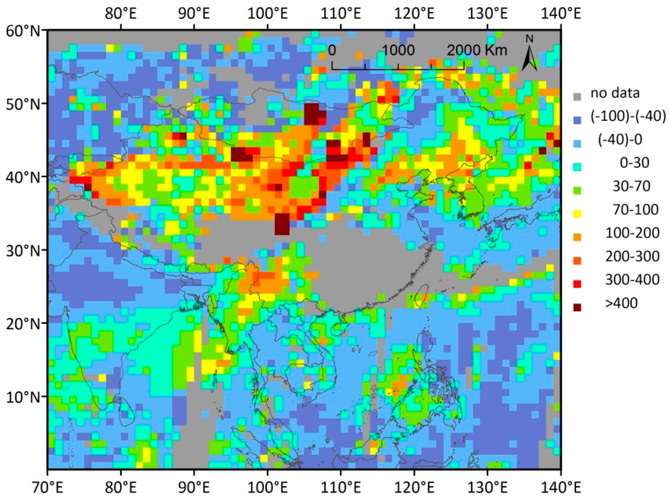 The mean MODIS AOD550 distributions over northeast Asia during the dust storm between 23 April and 25 April and average distributions in April between 2010 and 2014 are shown in Figure 8a,b, respectively. Anomalies calculated following the method given by [26] are given in Figure 9.