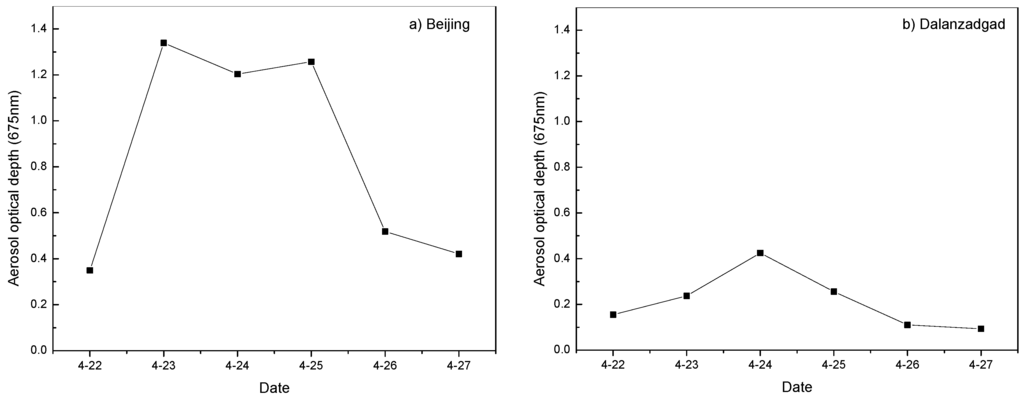 The AOD (675 nm) variability from 22 April 2014–27 April 2014 is shown in Figure 10. As seen, the AOD values were higher during the dust storm (23–25 April) than the days preceding and following it. The average AOD values at Beijing and Dalanzadgad during the dust storm were 1.266 and 0.306, respectively, whereas on the non-dusty days between 22 and 27 April, the AOD values ranged from 0.349–0.518 in Beijing and 0.093–0.155 in Dalanzadgad, with an average of 0.430 and 0.119, respectively. The dusty days include 23 April, 24 April and 25 April, whereas the non-dusty days include 22 April, 26 April and 27 April.